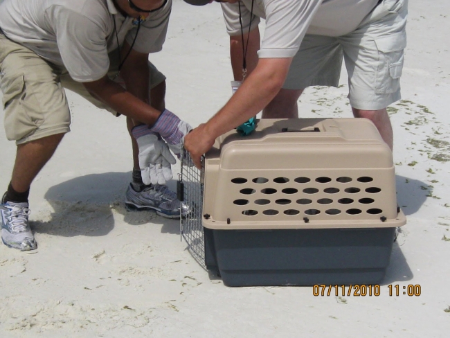 July 11, 2010 Destin, Fl - Refuge Operations Specialist Kenan Adams (Carolina Sandhills National Wildlife Refuge) rescues a juvenile Northern Gannet. The gannet was transported to one of several Oiled Bird Centers operated by Tri-State Rehabilitation. Photo by USFWS.