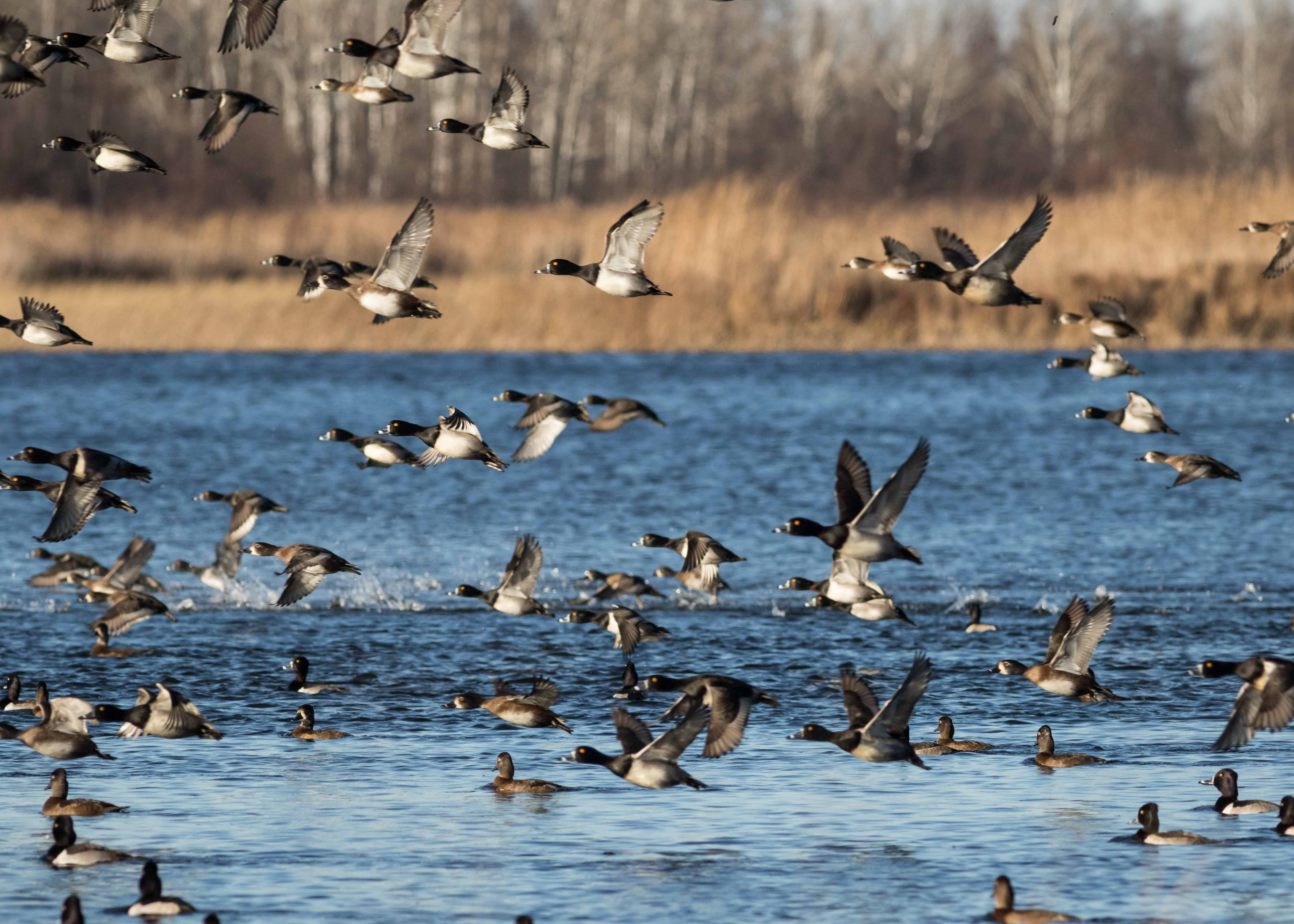 Ring-necked ducks take flight from shallow wetlands at Rice Lake National Wildlife Refuge in Minnesota. The wetlands usually boast bountiful wild rice that attracts migrating waterfowl in the fall.