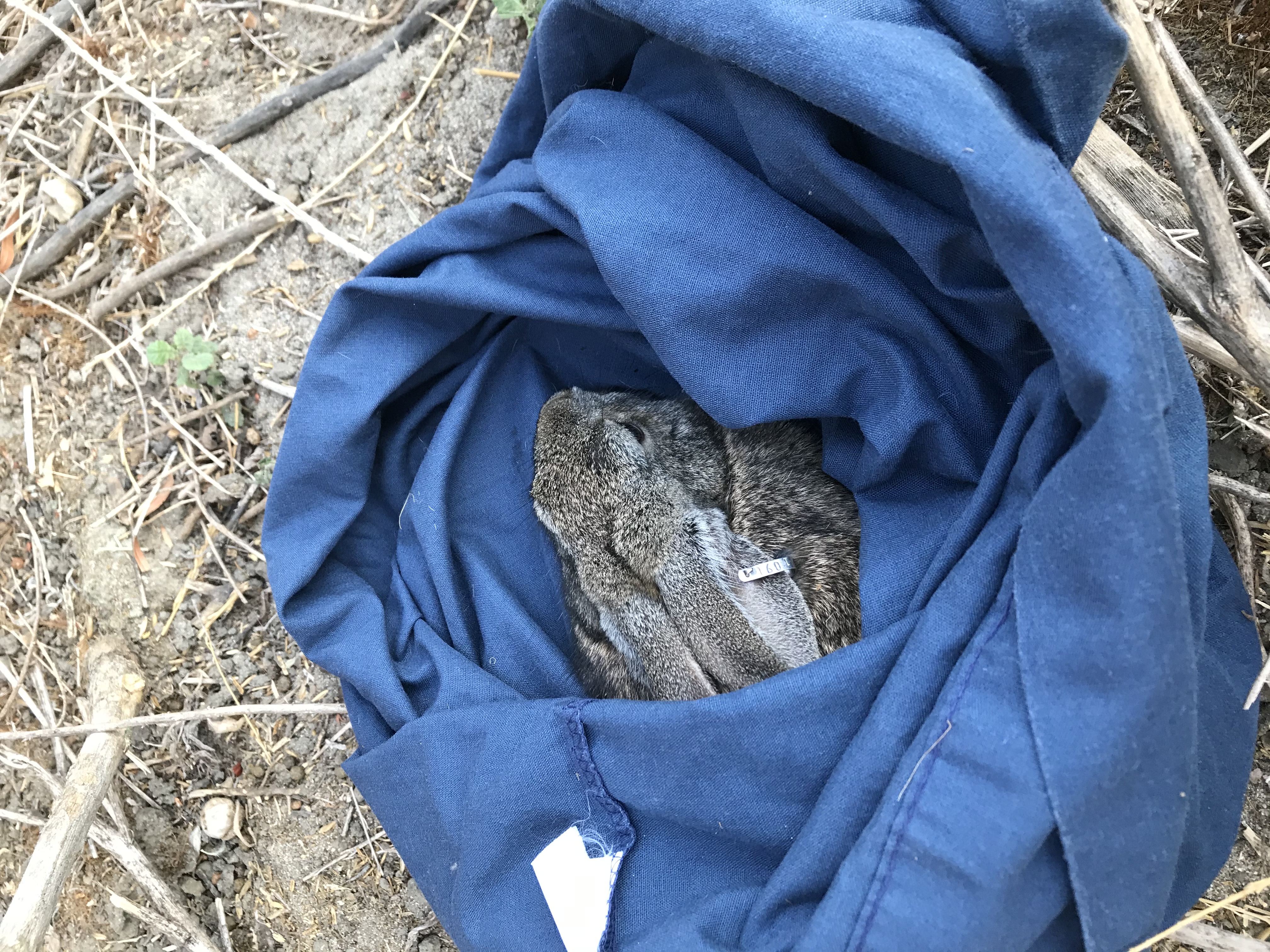 This riparian brush rabbit has received its vaccination for rabbit hemorrhagic disease virus serotype-2 and has been ear-tagged to indicate so. After receiving the vaccine, riparian brush rabbits are released at their original capture site.