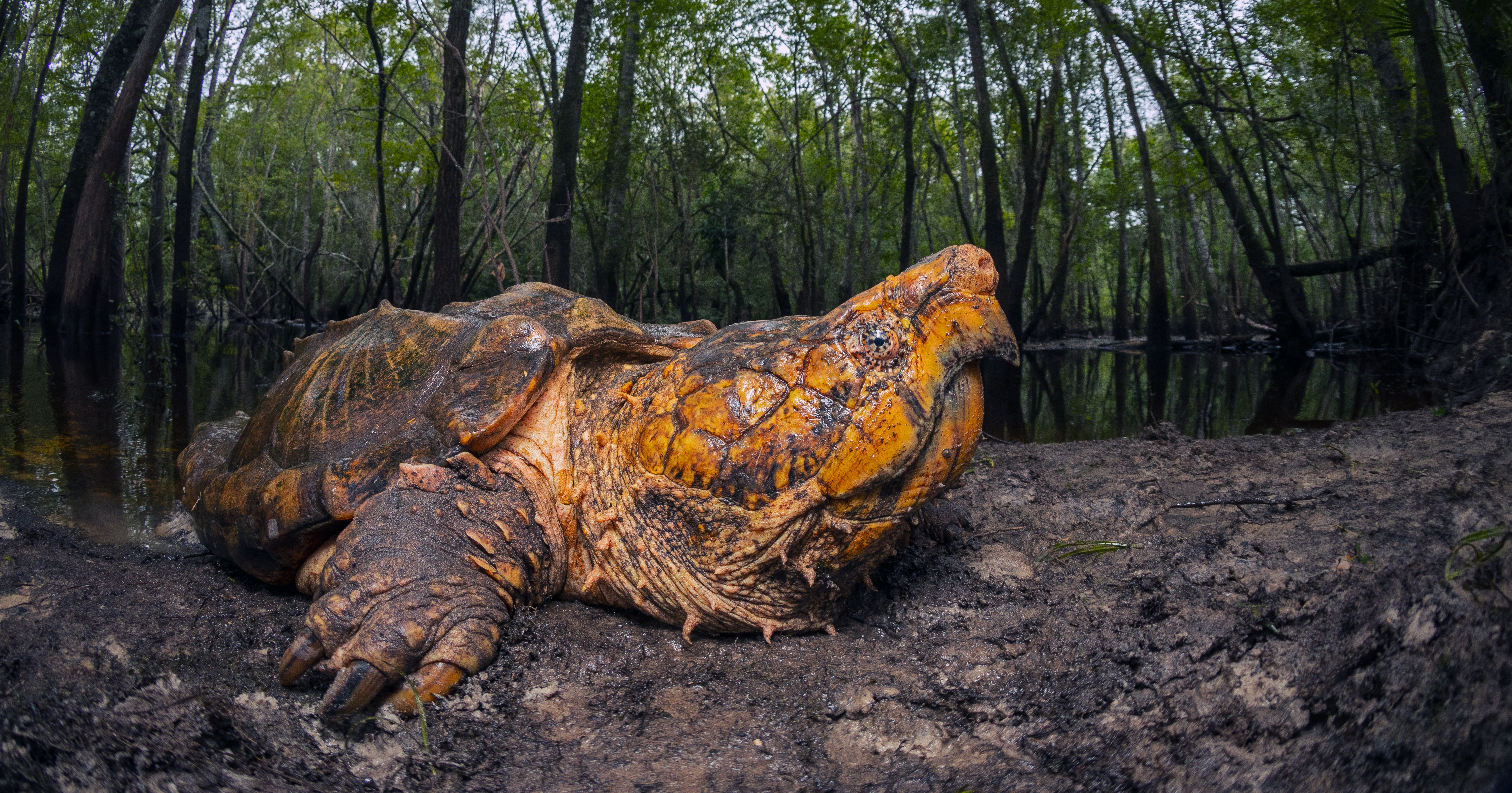 A 65 lb. male Suwannee alligator snapping turtle was captured in the flooded forest. Biologists will measure, weigh, and mark him before releasing him back into the river.