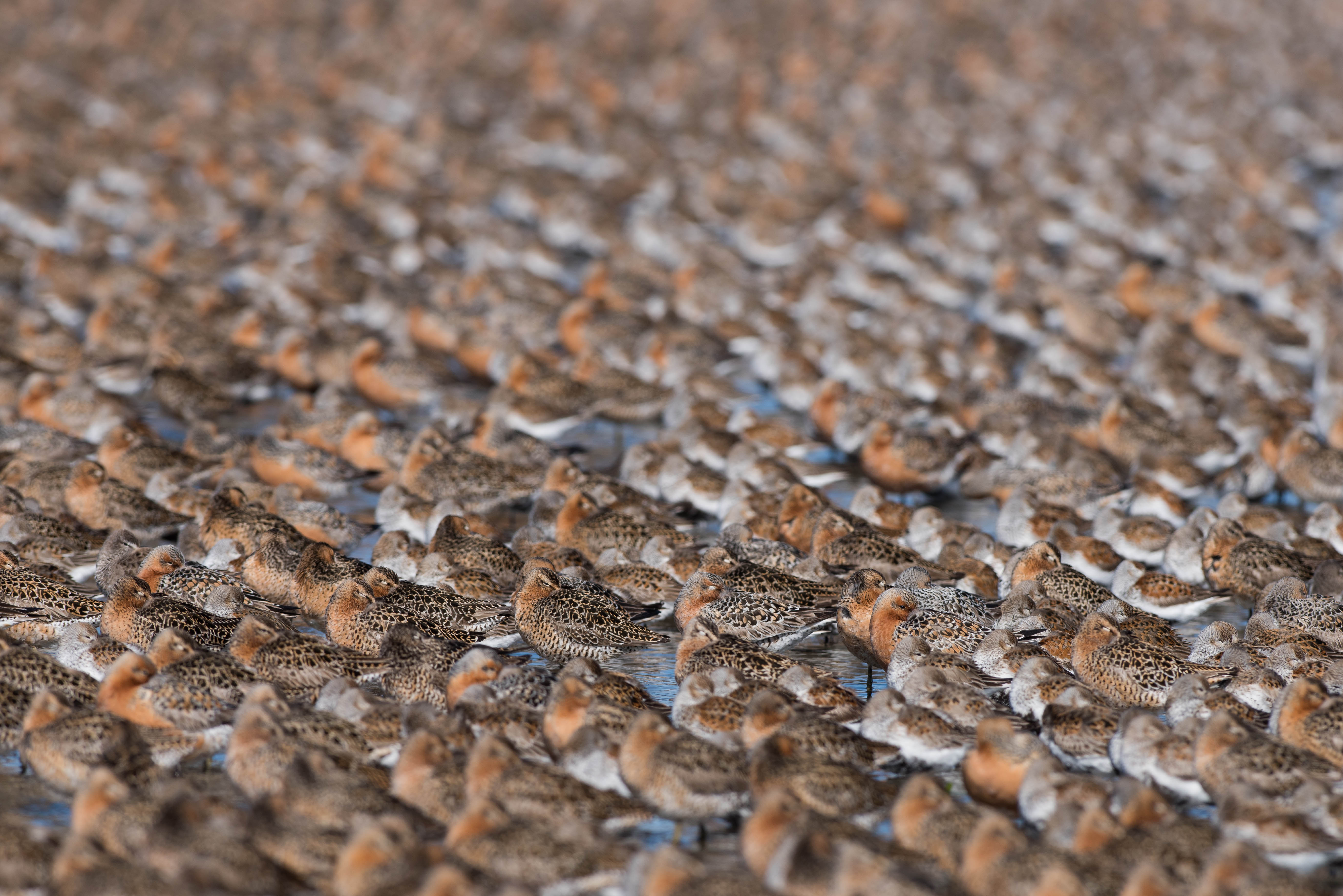 A roosting flock of Roselaari Red Knots and Western Sandpiper in Grays Harbor, WA.