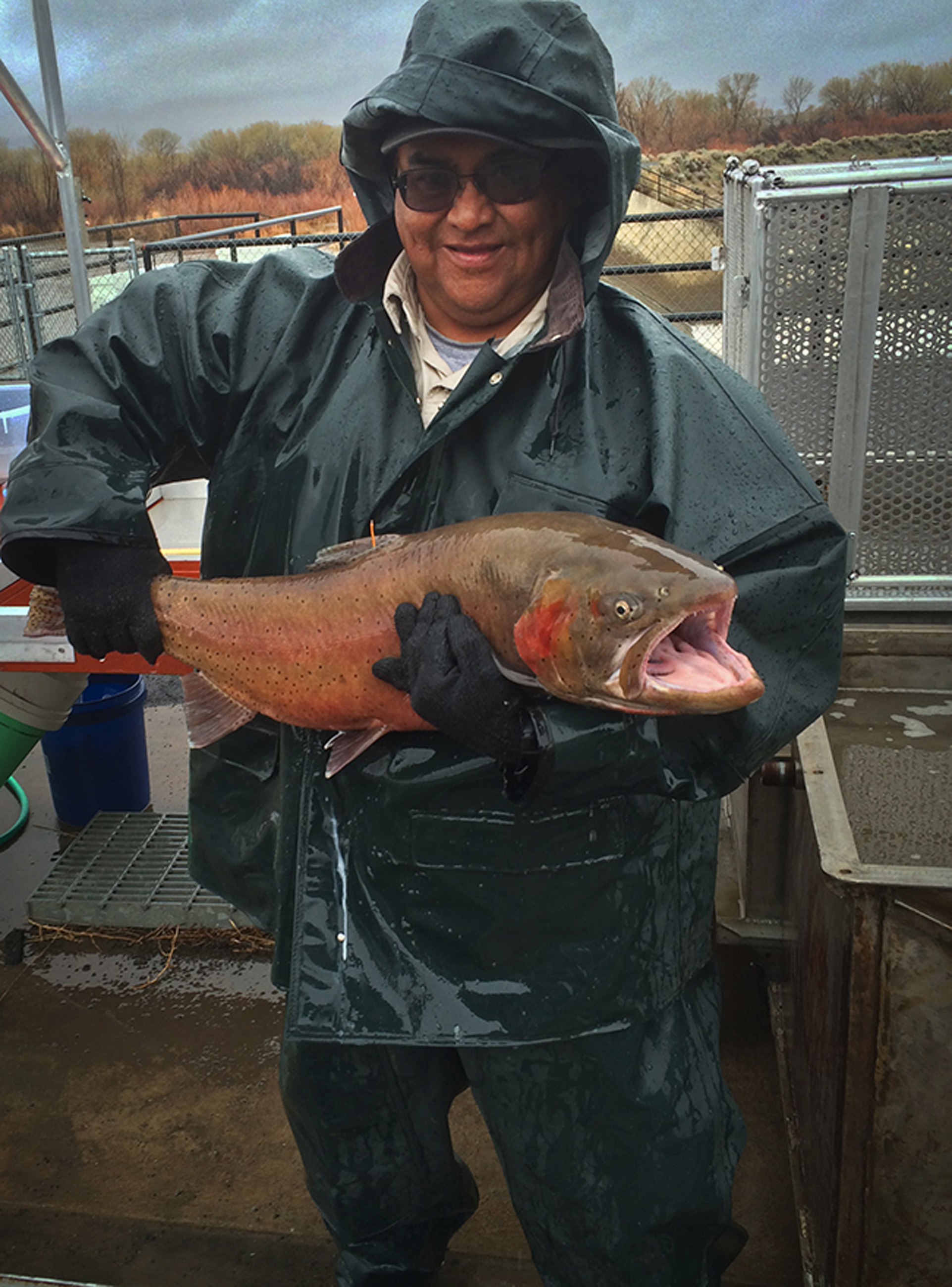 Roy Hicks, of Lahontan National Fish Hatchery, holds a large spawning-age Pilot Peak Lahontan cutthroat trout at the Marble Bluff Fish Passage Facility near Pyramid Lake. Credit: Tim Loux/USFWS