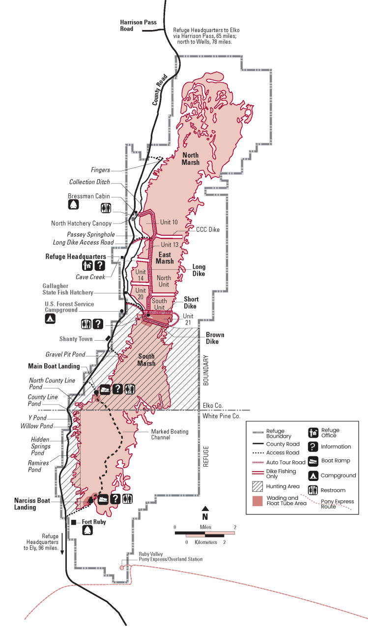 The refuge is about three miles wide and twelve miles long, from north-to-south. Most visitors approach from the north on a county road that runs the length of the refuge, near it's western boundary. From Refuge Headquarters, which is near the mid-point of the refuge, travelling south along the county road, it is 65 miles to Elko and 78 miles to Wells to the north. Ely, Nevada is 96 miles south. The refuge's marshes are divided into North, East, and South Marsh areas. North marsh has the fewest landmarks, but includes the Fingers trailhead, the Bressman cabin archeological site, and the beginning of a collection ditch that runs south between the marsh and the county road to the Gallagher State Fish Hatchery, which is just a milke south of Refuge HQ. A Forest Service campground is also located less than a mile south of the Fish Hatchery. East Marsh is divided into several numbered units that a separated by dikes. The central Long Dike carries an auto tour route from near Bressman Cabin to a T-shaped intersection with Short Dike. Short dike separates Unit 21 from the remainder of East Marsh. The auto tour route encircles Unit 21, returning to the county road on Brown Dike. South of Brown Dike is South Marsh. The northern half of South Marsh is marked as a hunting area. In addition, several small ponds along the west edge of South Dike are marked as hunting areas. Near the middle of South Marsh, at the southern end of the main hunting area, is the Main Boat Landing which also has information and a restroom. A marked boating channel is shown travelling south from Main Boat Landing through the South Marsh to Narciss Boat Landing, which is at the southern end of South Marsh. Narciss also has information and a restroom. Areas near Narciss, Main Boat Landing, and Unit 21 are also shown as open to wading and float tubes. South of the Narciss Boat Landing is the Fort Ruby archeological site and the site of the Ruby Valley Pony Express Overland Station. Most of the refuge is located in Elko County, Nevada. The southern half of South Marsh is in White Pine County.