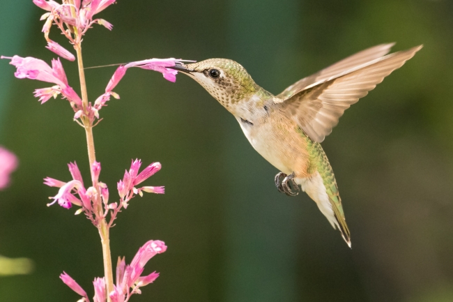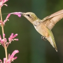 Female ruby-throated hummingbird drinking nectar from a pink flower