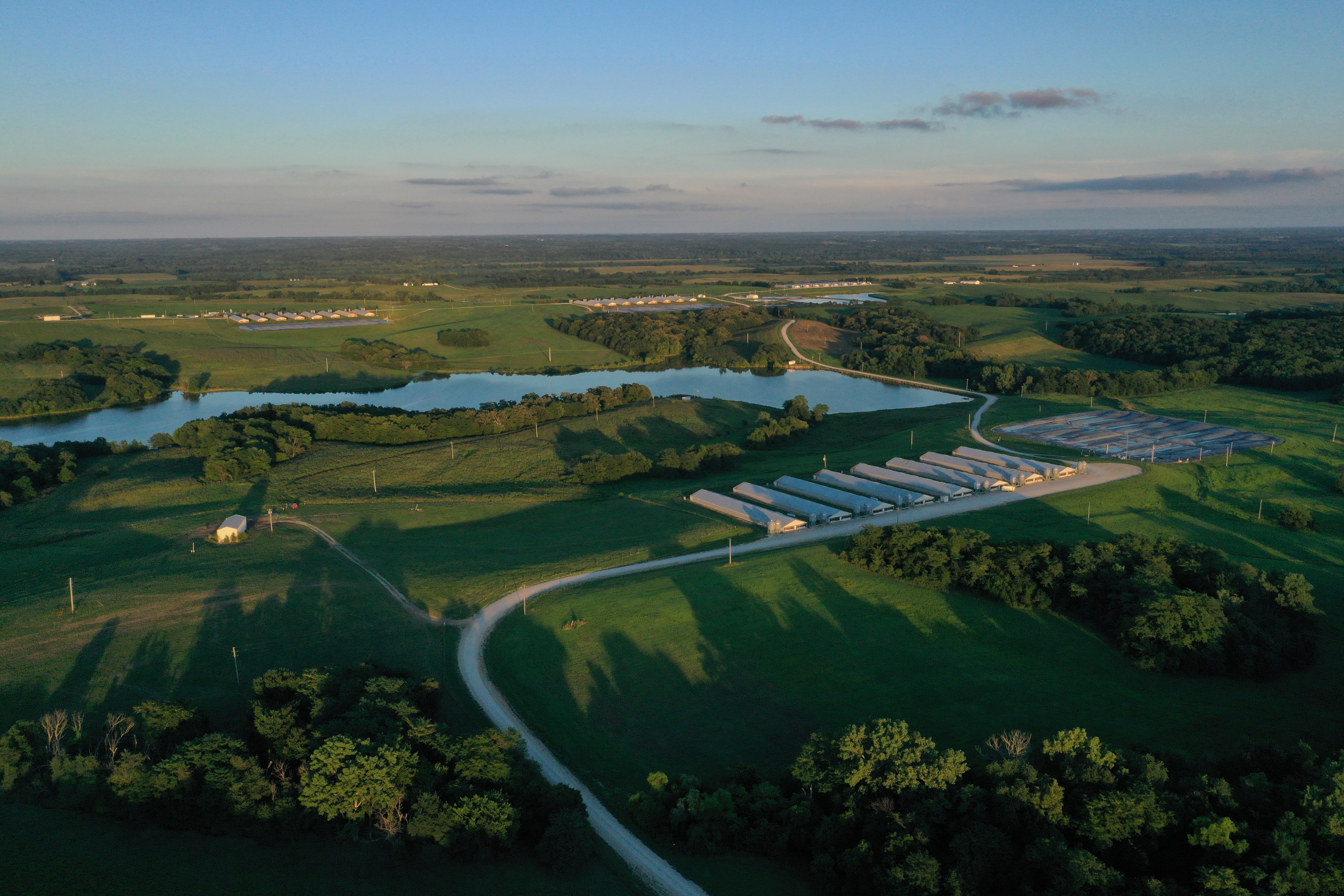 Aerial view of Smithfield Food's Ruckman Farms operation. The hog bars surrounded by hay fields, grasslands, and forests. Grassland restoration treatments were installed at this site.