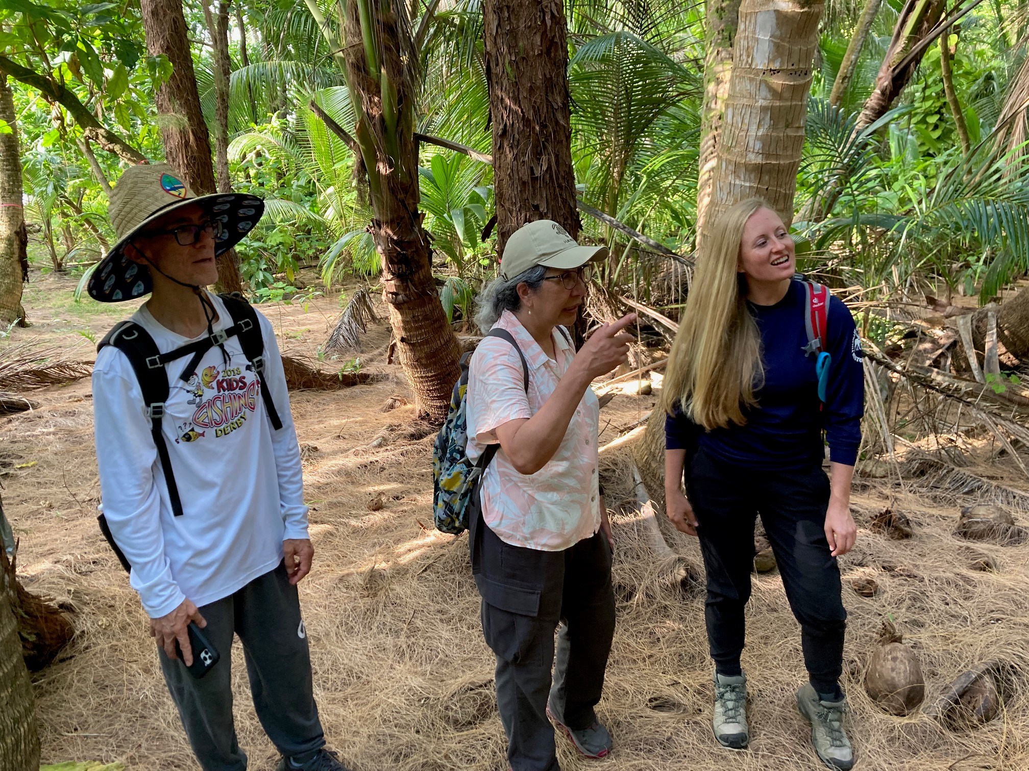 Ruth Utzurrum (center) is on Island Dano, Guam, standing with Jay Gutierrez (left), Chief of Guam's Division of Aquatic and Wildlife Resources (DAWR), and Lauren Thompson (right), wildlife biologist for DAWR.