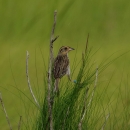 A saltmarsh sparrow (Ammospiza caudacuta) perches above the marsh.