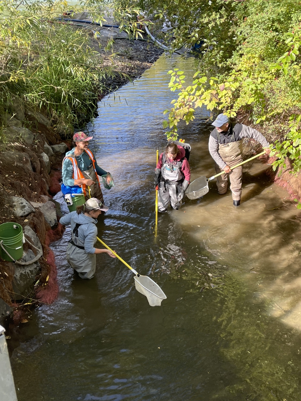 Mid-Columbia Fish and Wildlife Conservation Office staff defish the work area using nets and a backpack electroshocker before dewatering a channel for restoration.