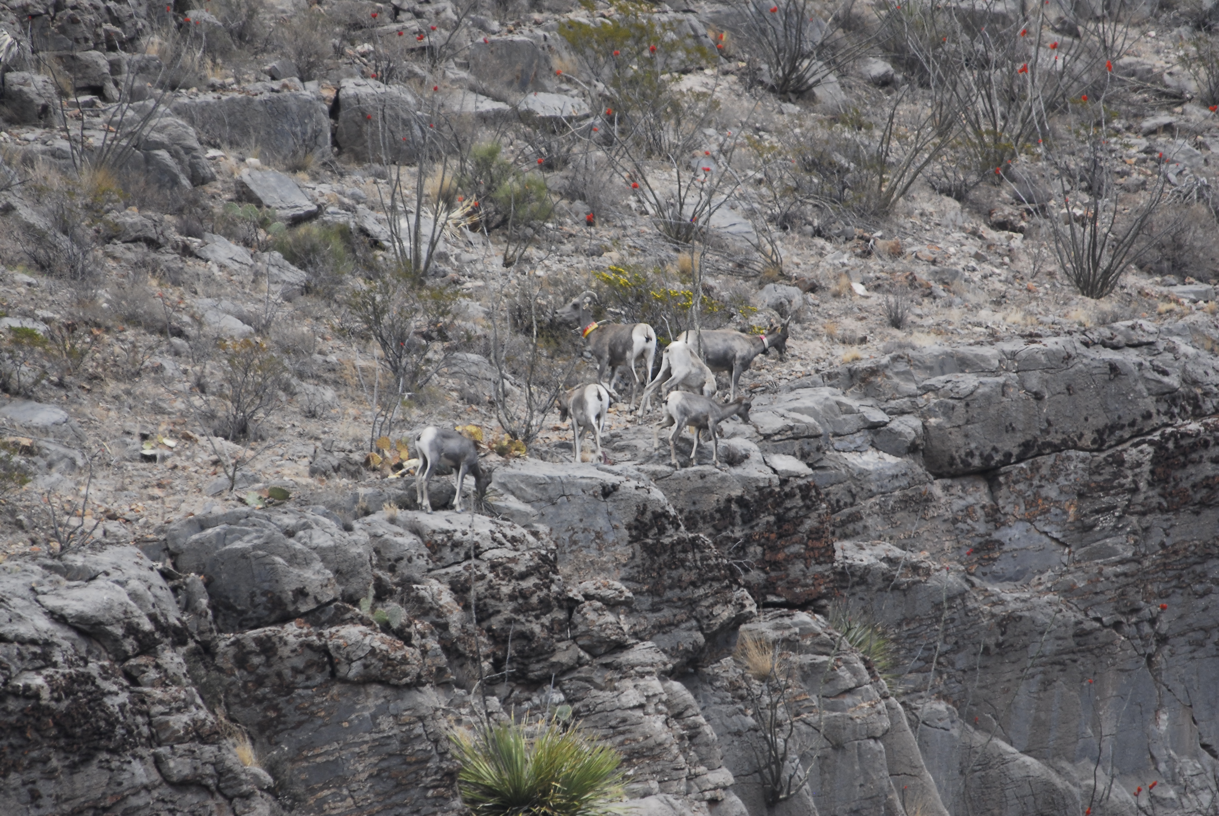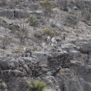 Group of desert bighorn sheep ewes with their lambs on San Andres Mountain Range escarpment.