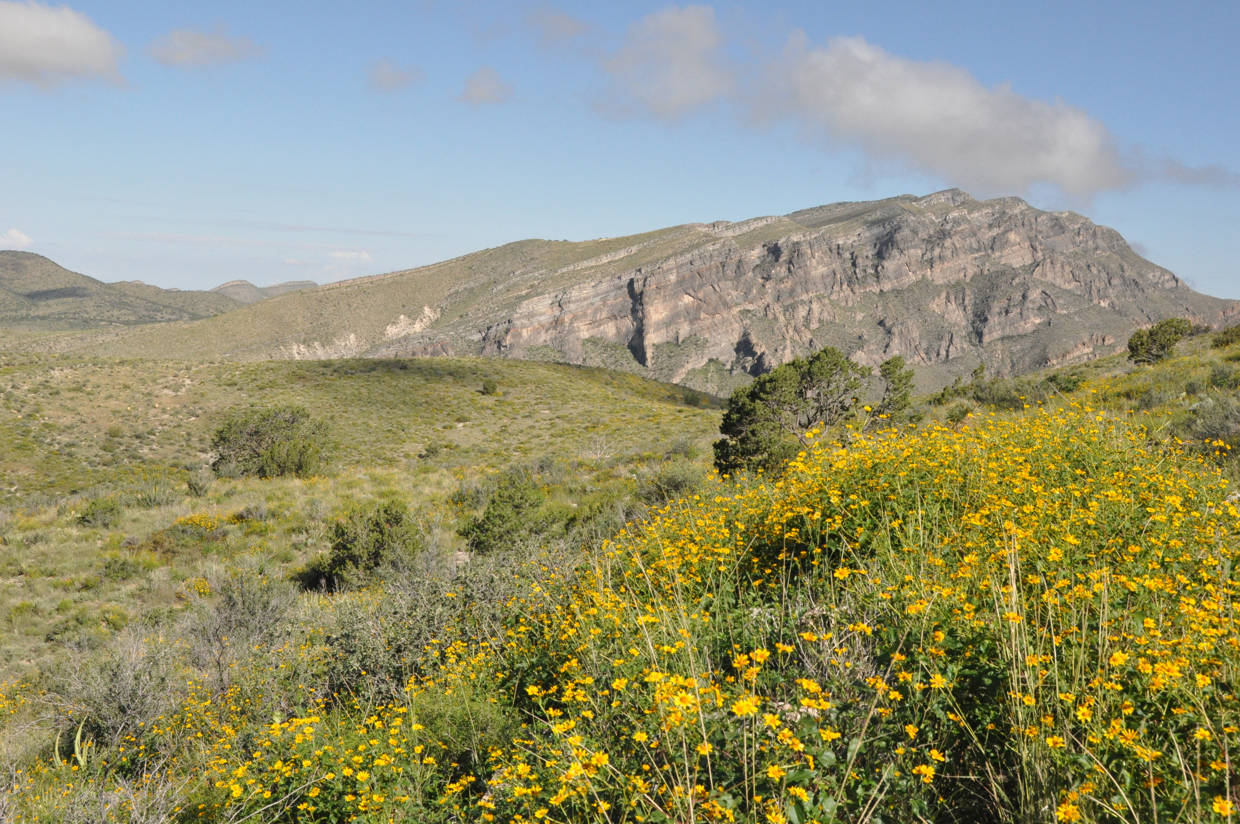 Landscape view of San Andres National Wildlife Refuge mountainscape with spring wildflowers in the foreground.