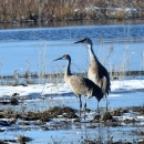 Sandhill cranes on a snowy marsh at Iroquois National Wildlife Refuge in New York.