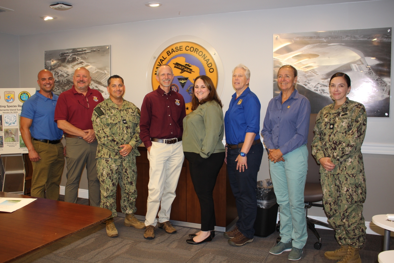 Carlsbad Fish and Wildlife Office staff join Naval Base Coronado personnel to celebrate signing of Conservation Candidate Agreement protecting San Clemente Island species.