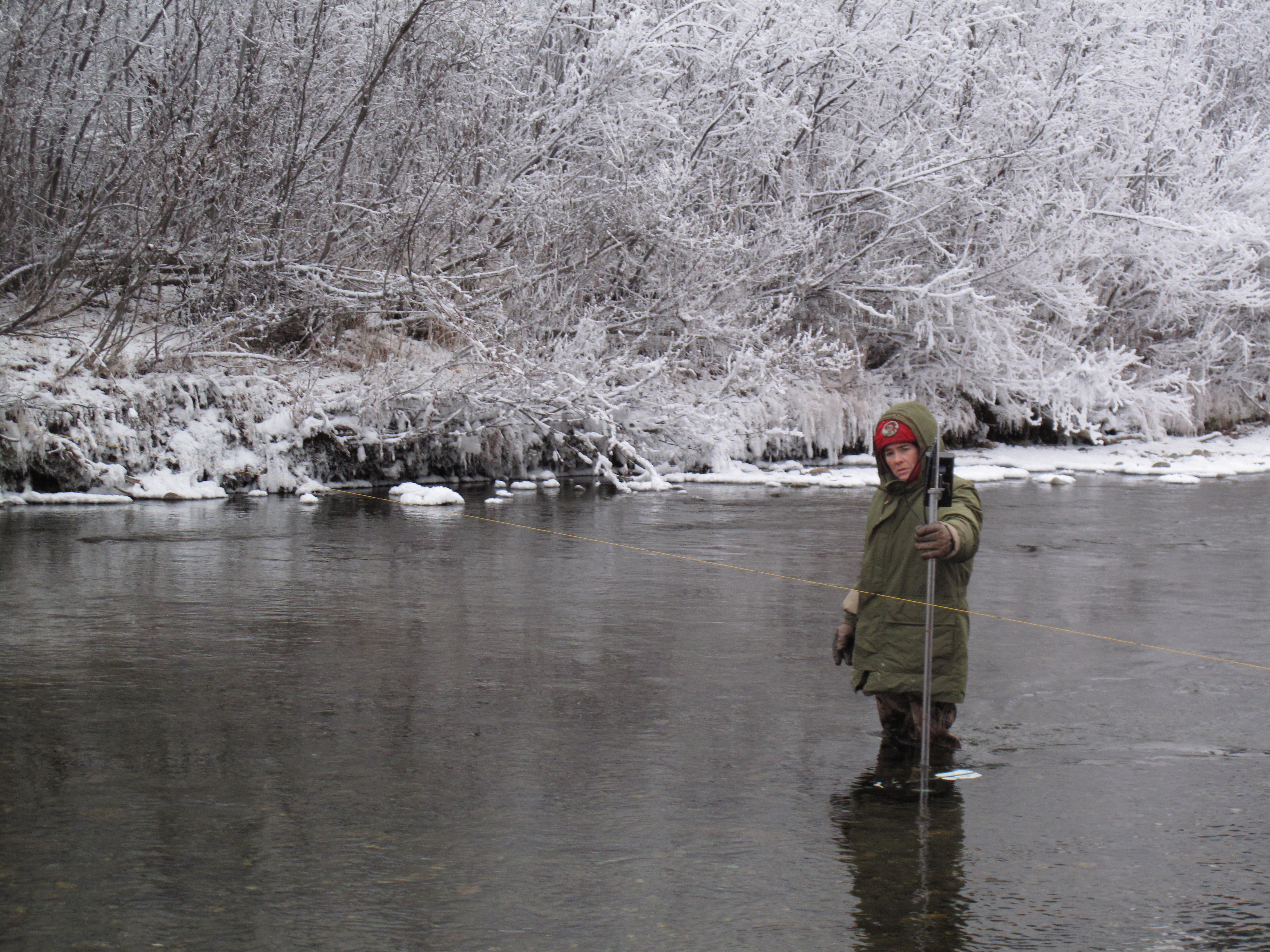 A scientist takes a flow measurement in Henshaw Creek, Kanuti National Wildlife Refuge.