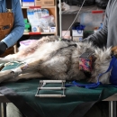 A sedated wolf Mexican lays on a table as staff conduct a health check.