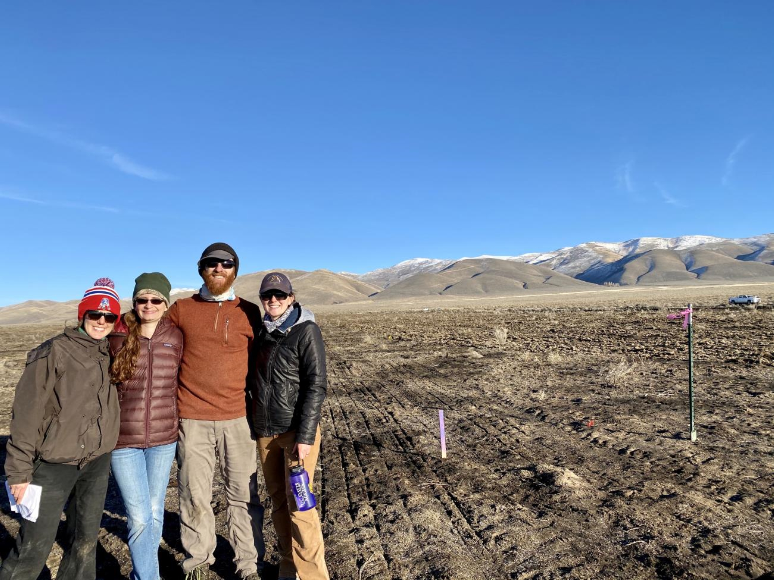 Sarah Kulpa, left, U.S. Fish and Wildlife Service, Beth Leger, left center, University of Nevada, Reno, Owen Baughman, right center, The Nature Conservancy, and Alison Agneray, University of Nevada, Reno, seeding rows at the 2019 Rebel Creek Fire in December 2019