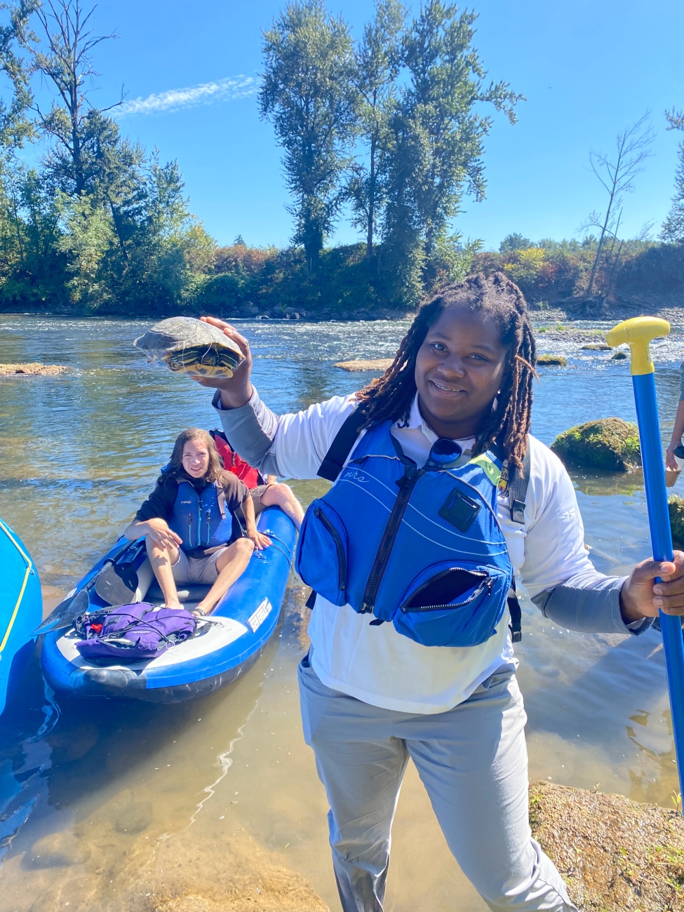 Service fish biologist Dr. Nicole Hams holds a red-eared slider (turtle) found on a aquatic education field trip, which is invasive in the State of Oregon, and turned over to the Oregon Department of Fish and Wildlife for research and disposition.