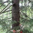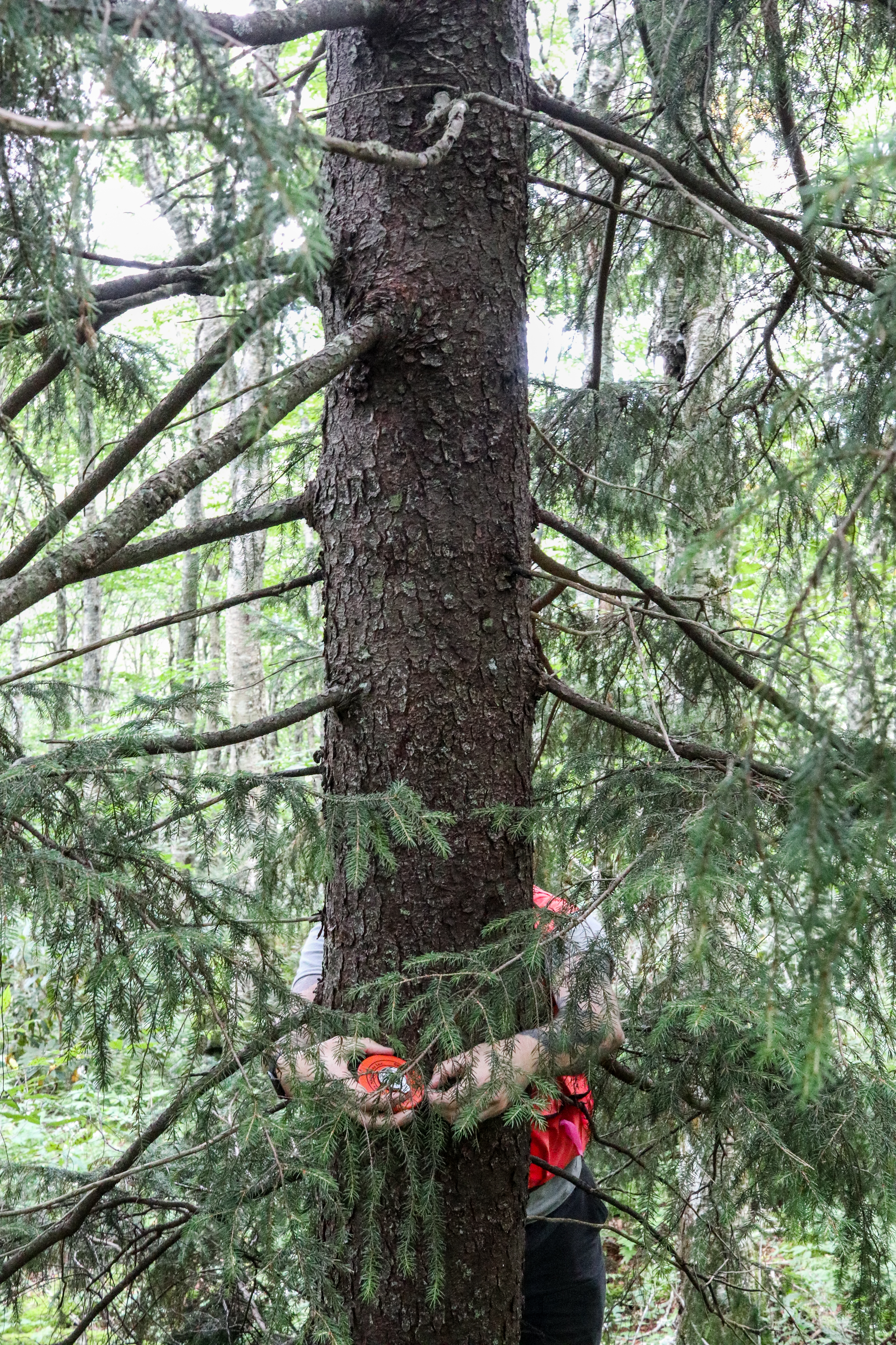 Forester Shawn Swarts measures the diameter of a spruce tree targeted for release. Once competing trees are killed, the expectation is this tree will use the additional food, water, and light to grow larger.
