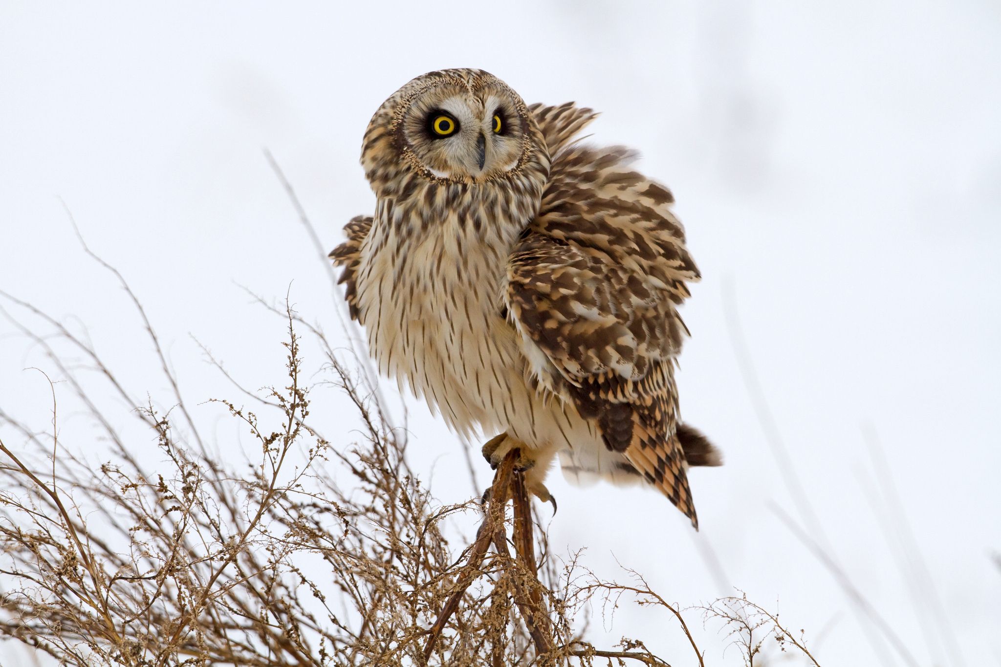 A short-eared owl fluffs up its feathers to defend against chill winds near Patoka River National Wildlife Refuge in Indiana.