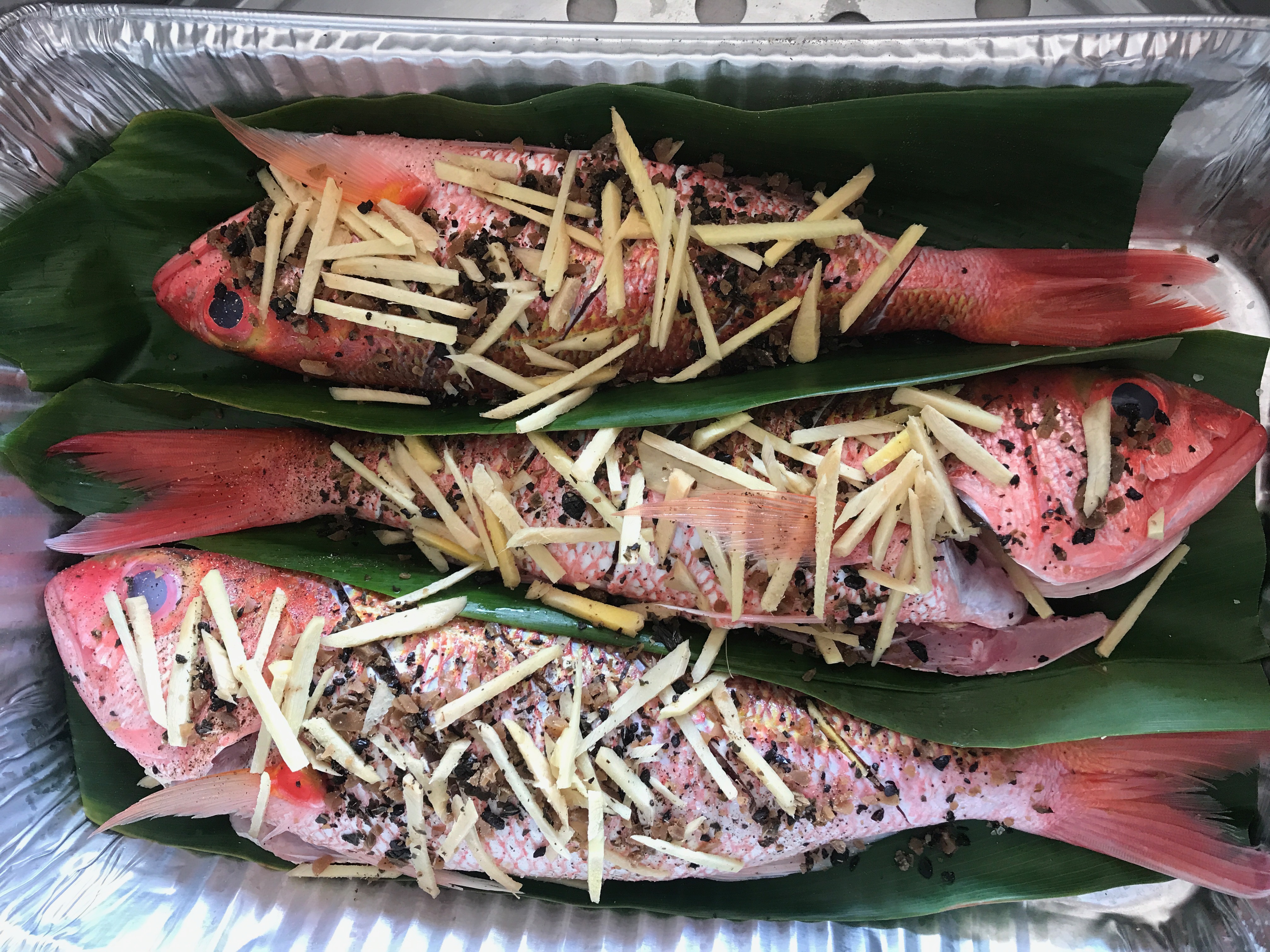 Three ʻula ʻula, also known as short-tail red snapper, prepared for a meal. Sustainable fishing practices provide a local food source and food security.