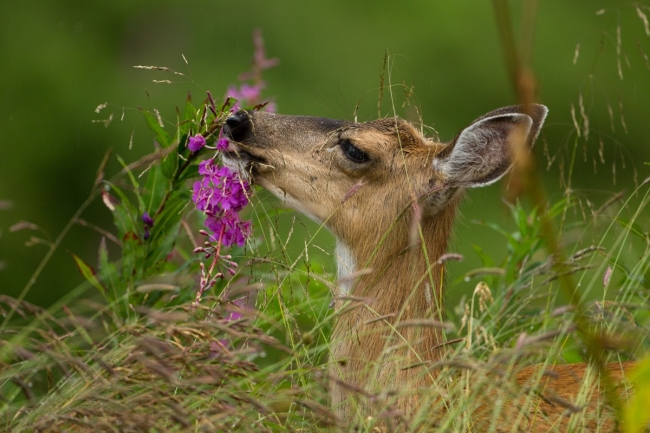 A Sitka black-tailed deer eats fireweed at Kodiak National Wildlife Refuge in Alaska.