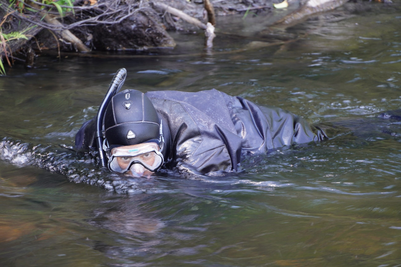 Fisheries technician conducting a river snorkel survey for fish estimates on Cook Creek in Washington State.