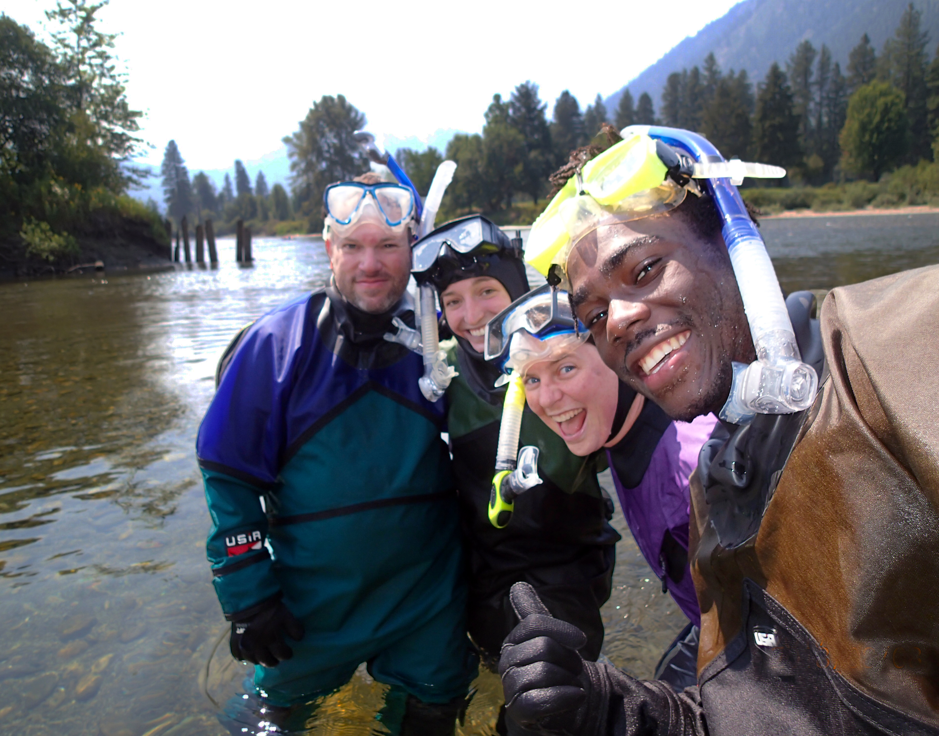 Directorate Fellow, Jonathan Blackmon snaps a selfie with Yakama Nation Fisheries and Mid-Columbia Fish and Wildlife Service staff during a snorkel survey for native fish.