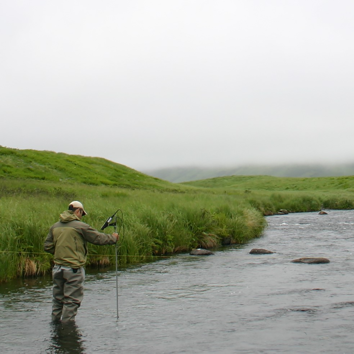 Hydrographer making a streamflow measurement on Kodiak NWR.