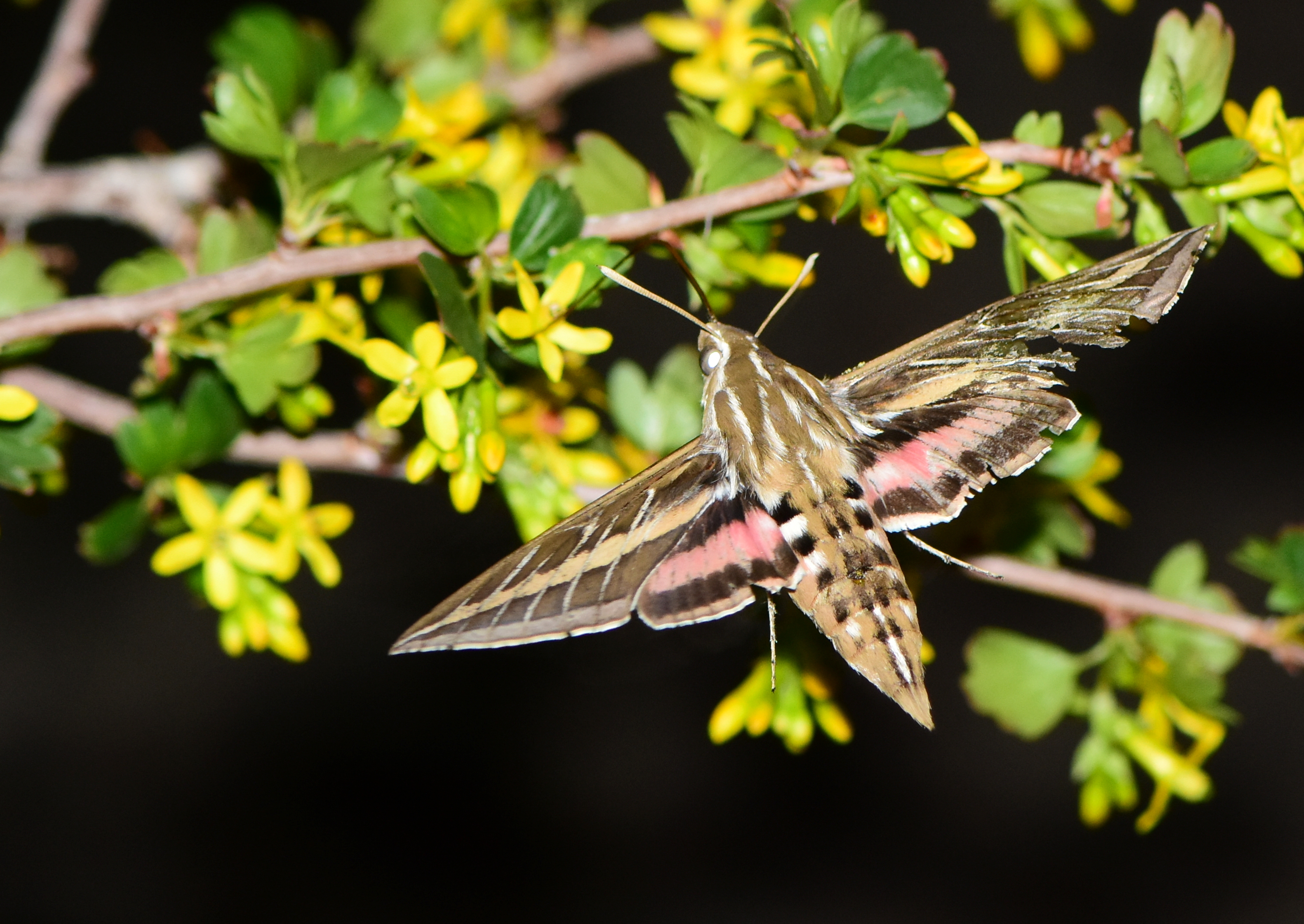 A white lined sphinx moth pollinating a shrub with bright yellow flowers.