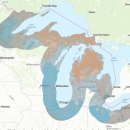High concentration of spring migrants, shown in blue, along the western edge of the Great Lakes basin.