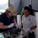 Fisheries biologists Michelle Workman of the U.S. Fish and Wildlife Service, right, and Elif Wilkins of the National Oceanic and Atmospheric Administration implant a tiny transmitter in a juvenile spring-run Chinook salmon, enabling the San Joaquin River Restoration Program to track the salmon’s journey from the river release site to the ocean.