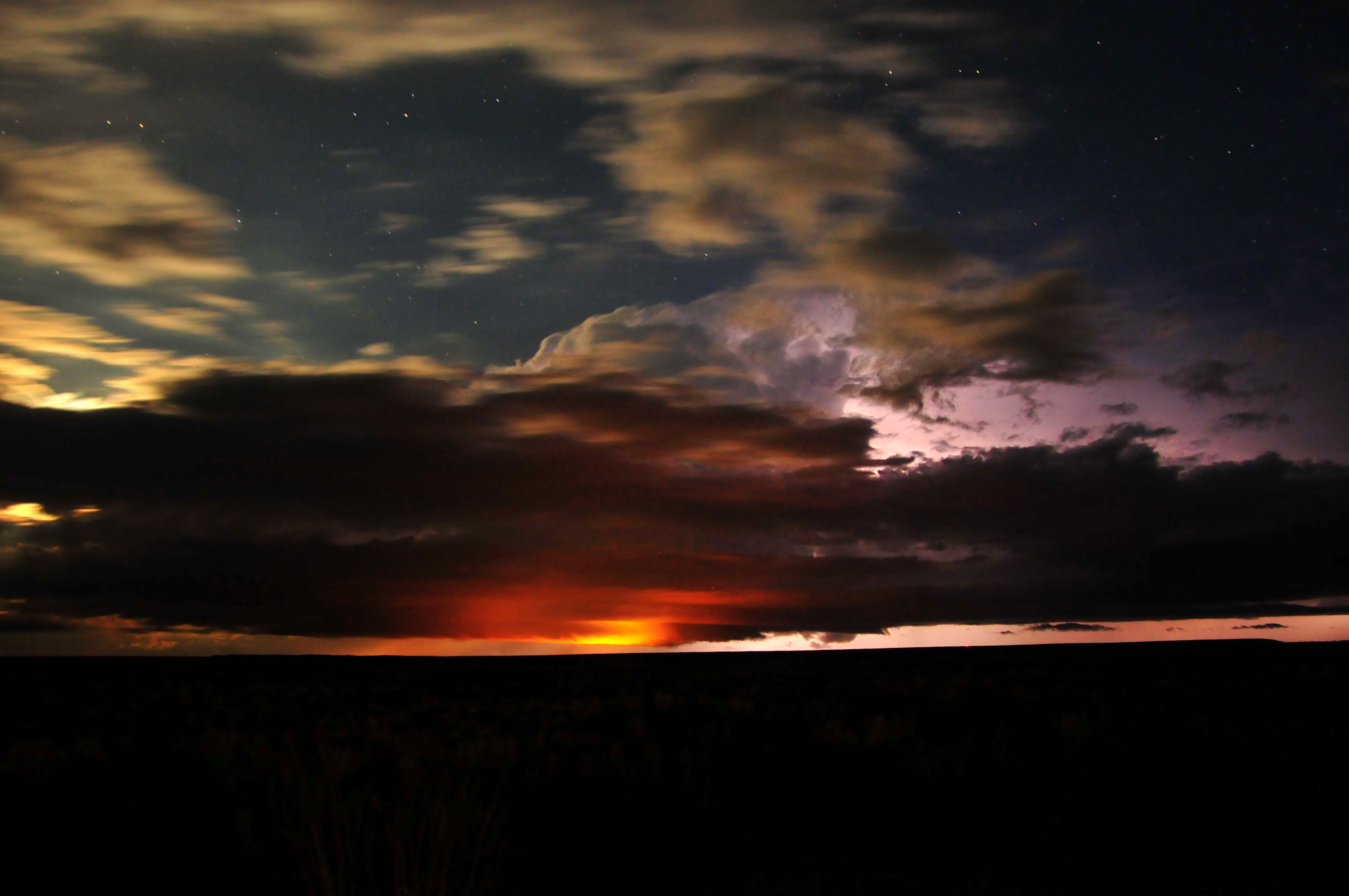Sunset, stars, and storm clouds converge over a silhouetted landscape