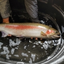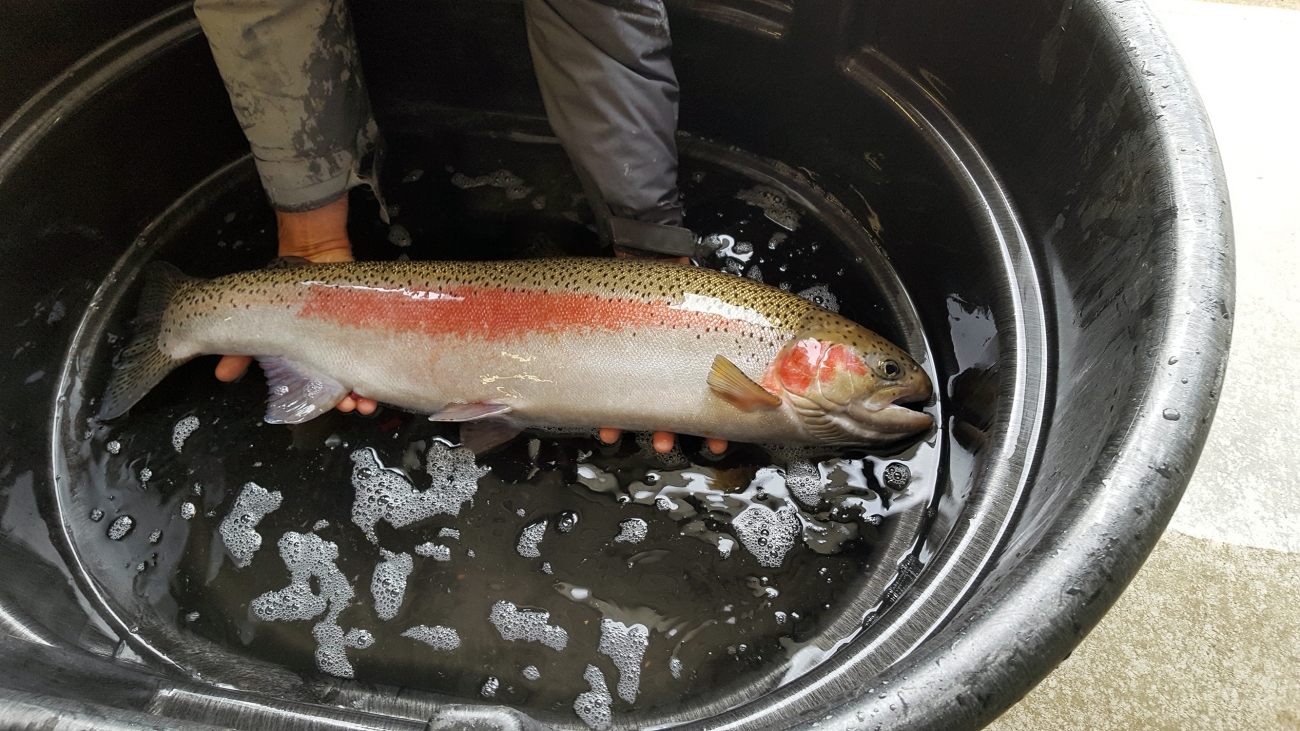 A reconditioned female steelhead is biosampled prior to release back to the Methow River to hopefully spawn again (on its own this time).