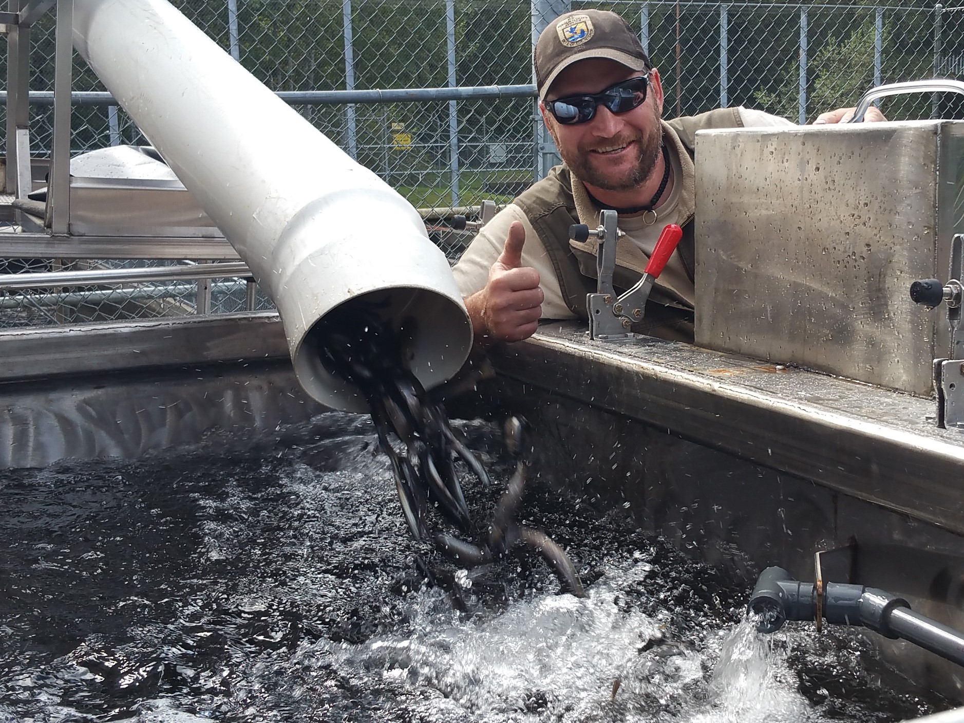 Quinault National Fish Hatchery staff transferring steelhead for tribal net-pen release.