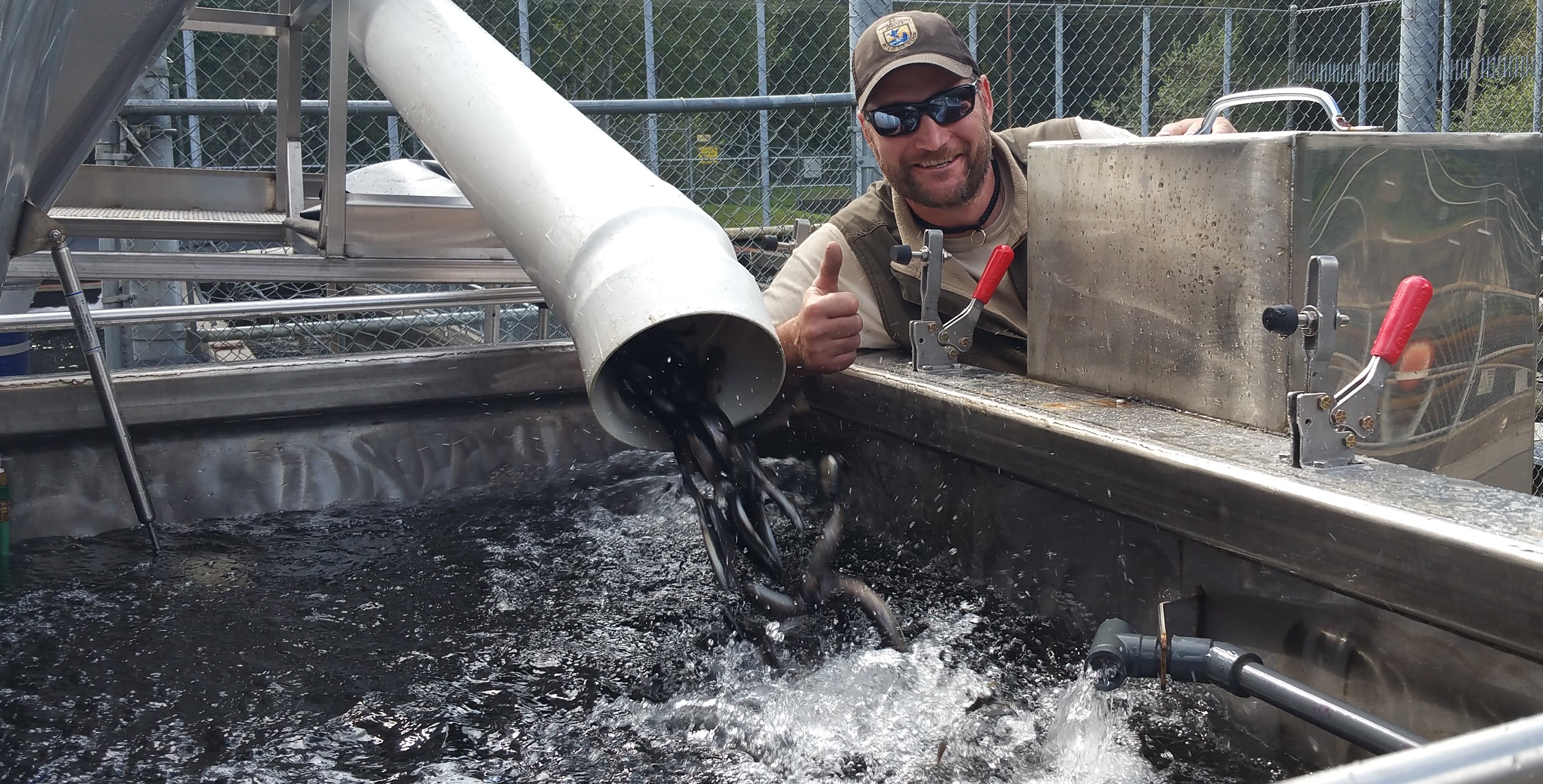 Quinault National Fish Hatchery staff transferring steelhead for delivery to the Quinault Indian Nation net pen program.