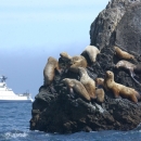 Steller’s sealions in the Gulf of Alaska with the R/V Tiglax in the background within Maritime National Wildlife Refuge