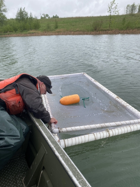 Successfully caught musky are carefully relocated to a floating holding pen.