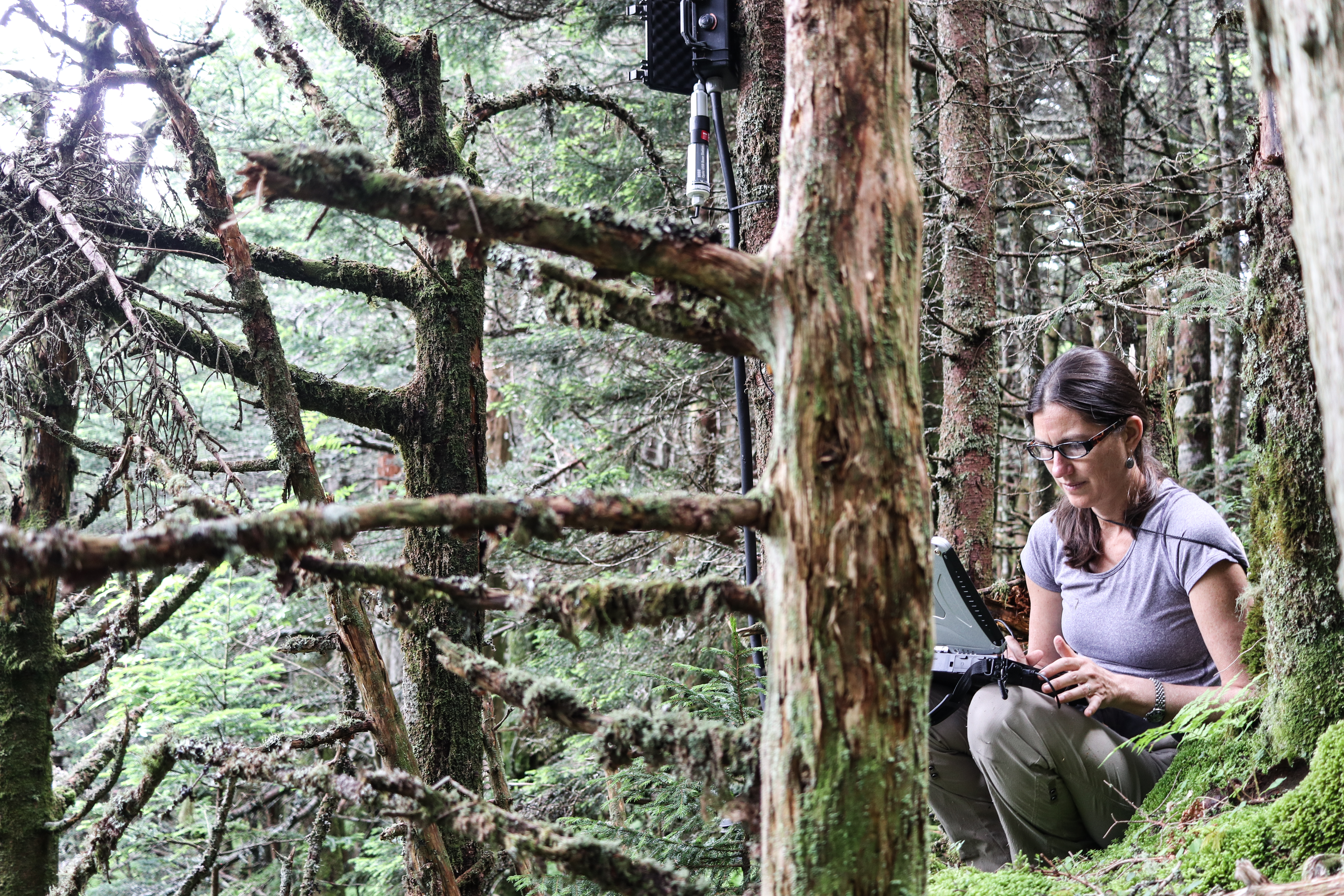 Sue Cameron recording data in a forest on spiders on Mt. Mitchell in North Carolina