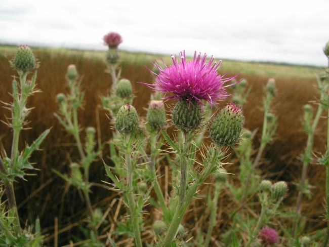 Suisun thistle is a perennial herb with slender stems that are 3 to 4.5 feet tall and well branched, with pale lavender-rose flower heads that appear between July and September.
