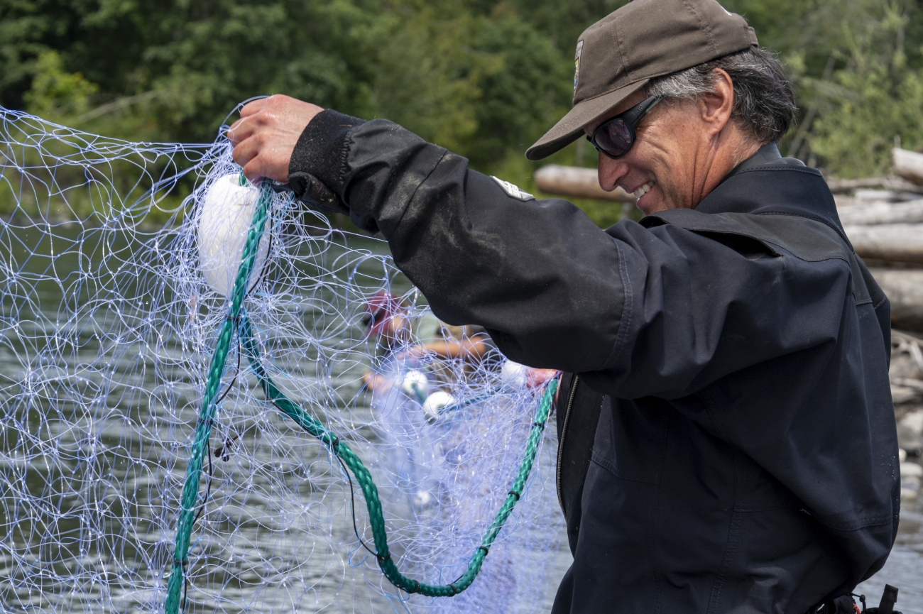 Service employee Roger Peters prepares a tangle net for sampling on the Elwha River in Washington State.