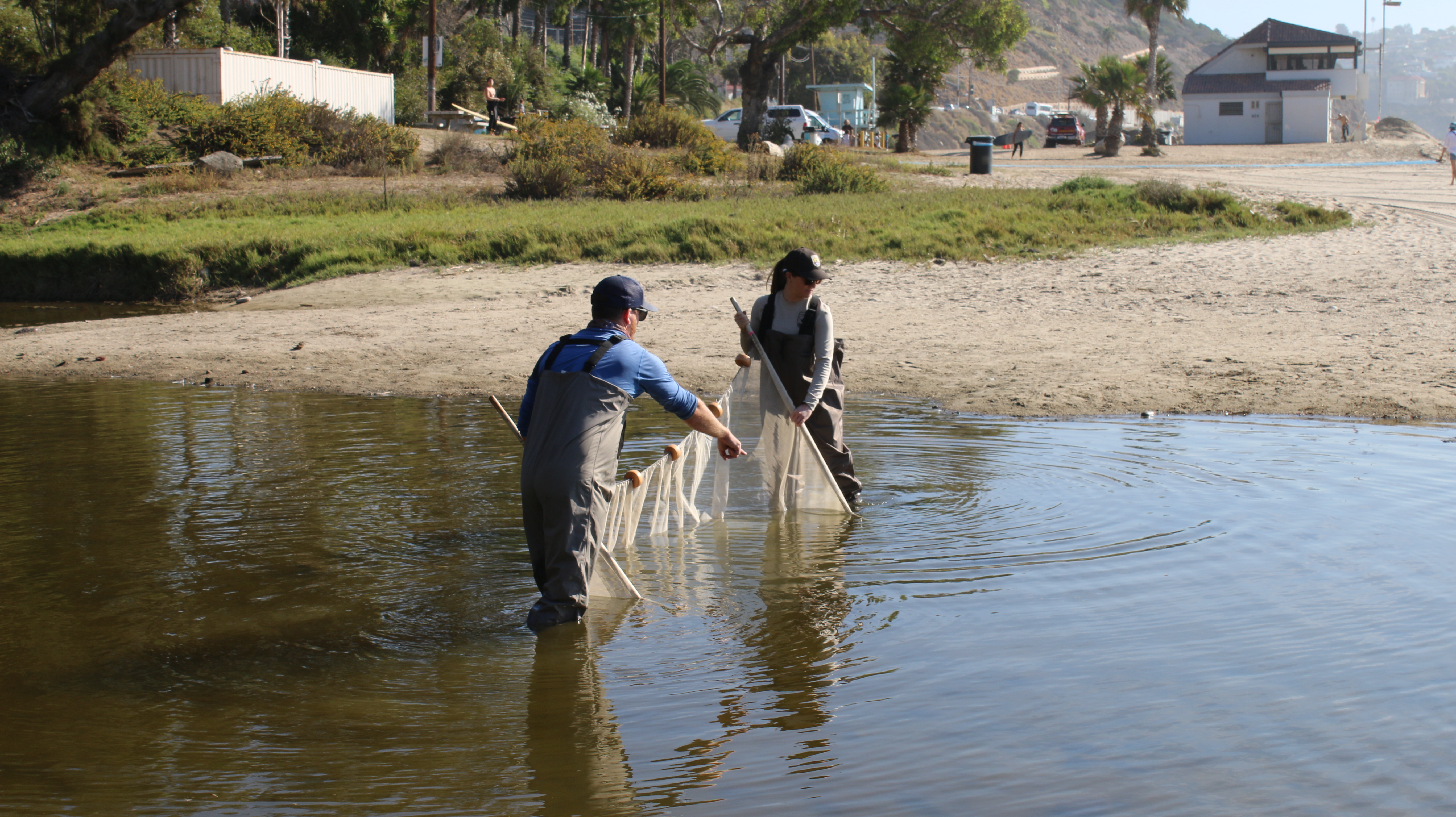 Two biologists dressed in waders holding a seine net in the Topanga Lagoon. Photo credit: Vanessa Morales/USFWS.