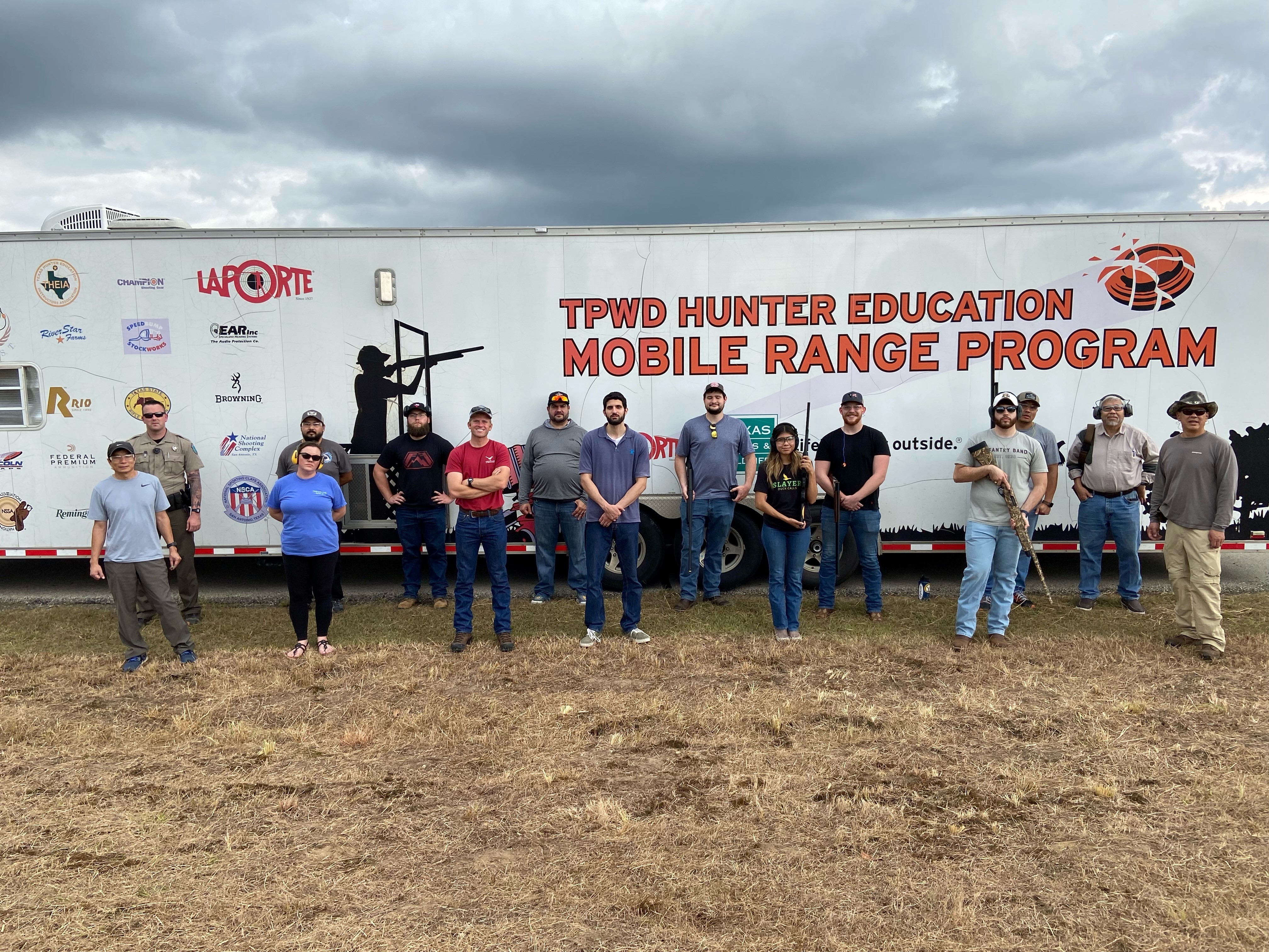 Purtis Creek Waterfowl 101 Program shooting sport youth participants and mentors stand in front of the Hunter Education Mobile Range.