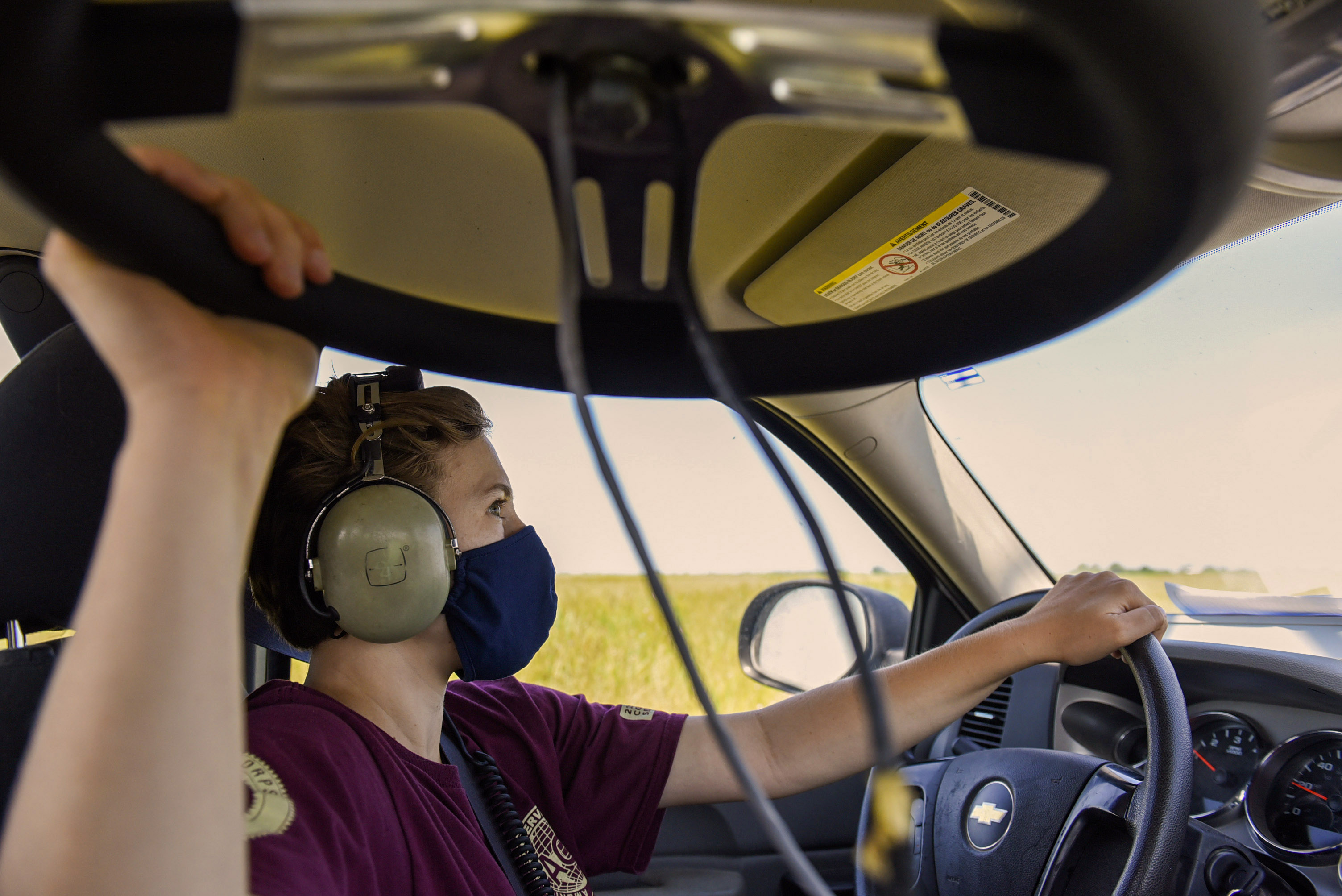 At Attwater Prairie Chicken National Wildlife Refuge in Texas, biology intern Eva Sload drives and tracking truck and listens for radio signals as she turns the antenna wheel.