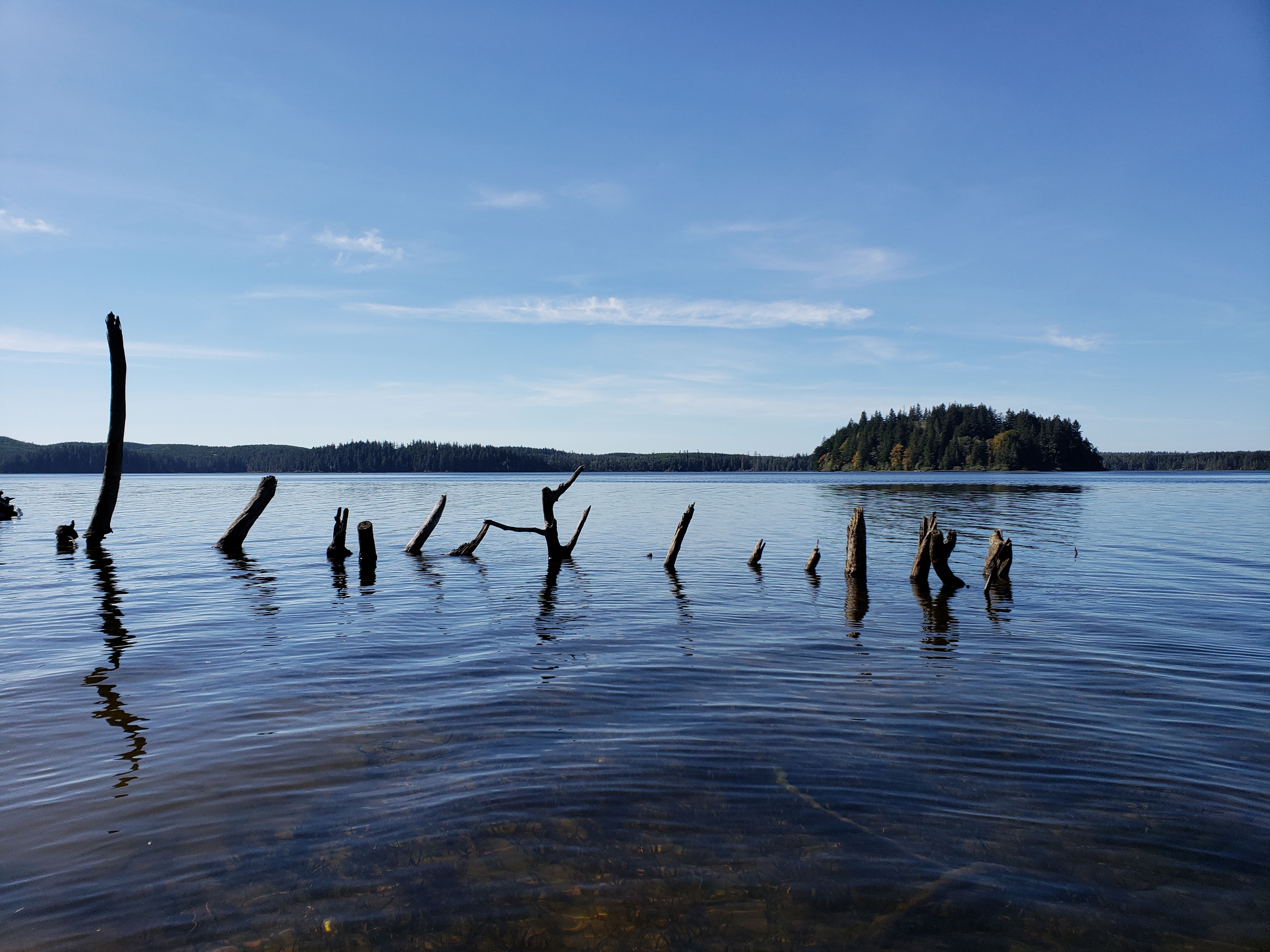Traditional Makah territory at Lake Ozette, looking towards Tivoli Island. Makah National Fish Hatchery is also instrumental in providing support for the Tribe's ESA listed Lake Ozette sockeye salmon program. The access and operation of the Makah Tribe's Lake Ozette facility was damaged in the November 2021 floods. Additionally, increasing frequency of early droughts over the last several seasons has changed the release timing for the Lake Ozette sockeye to much sooner than was typical when the program first started in the early 1980s.
