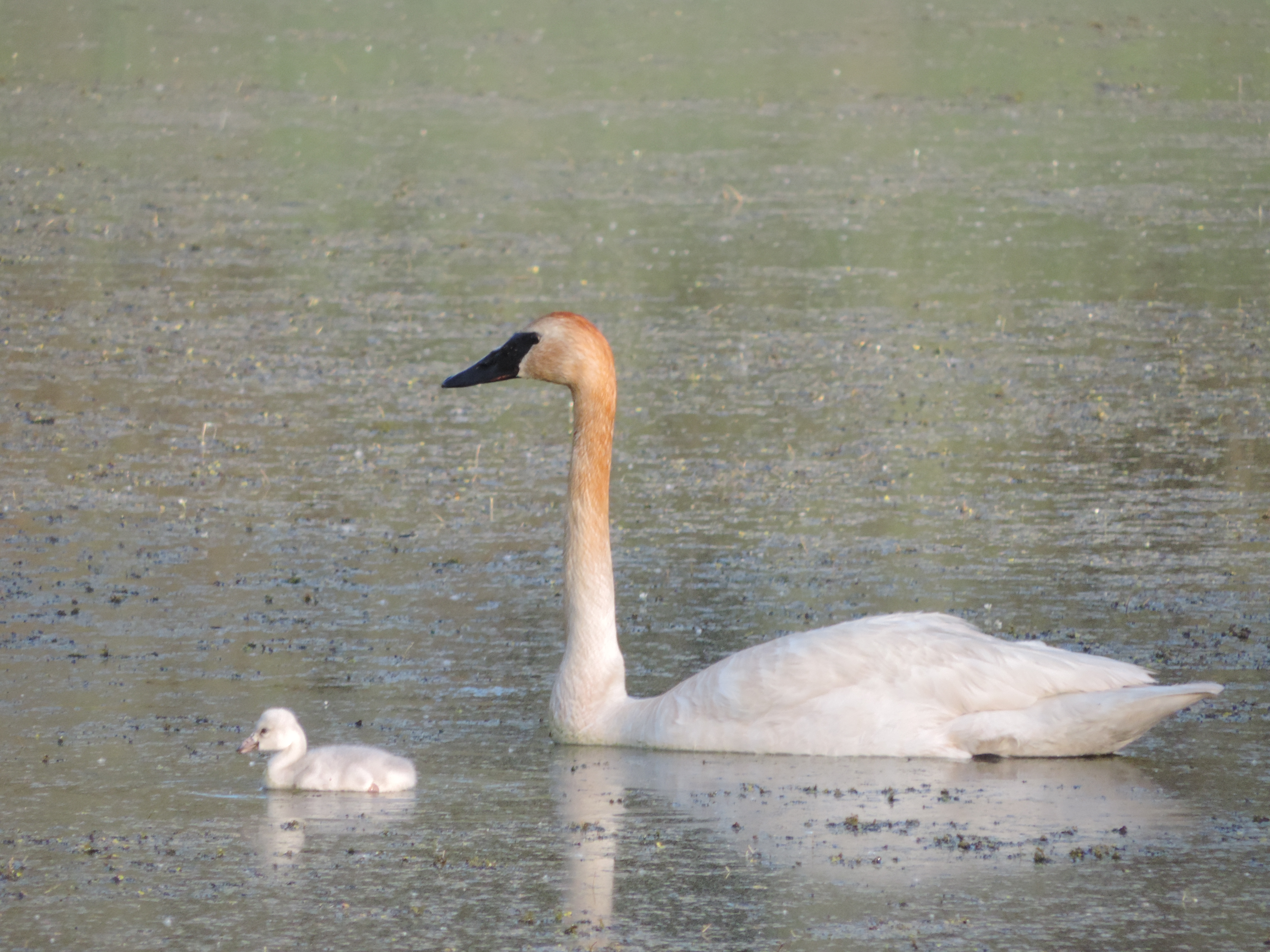 Trumpeter swan and young swimming in Pablo Refuge day use pond