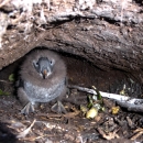 A tufted puffin chick halfway between puffling and fledgling at Alaska National Maritime Refuge.