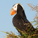 A tufted puffin on an island off the coast of Kodiak Island in Alaska.