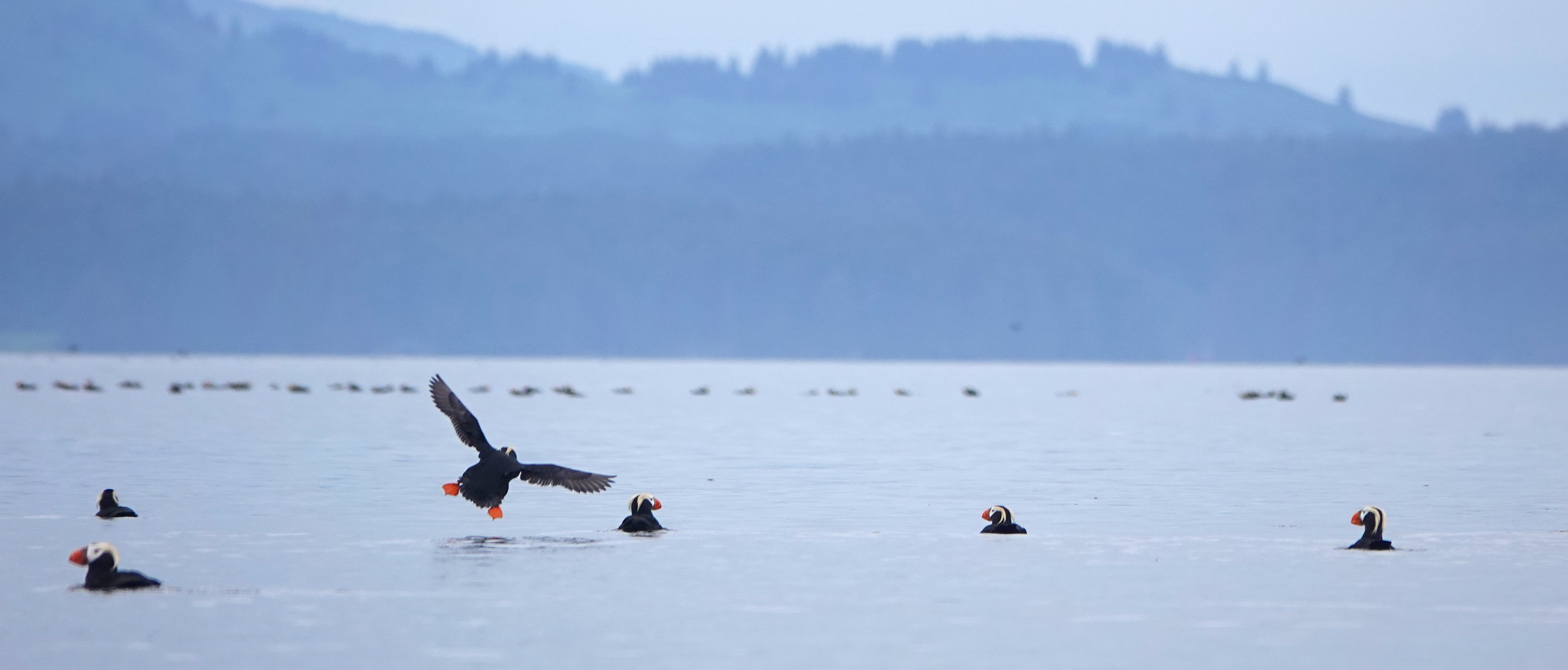 A tufted puffin lands into a group on the ocean near Kodiak Island.