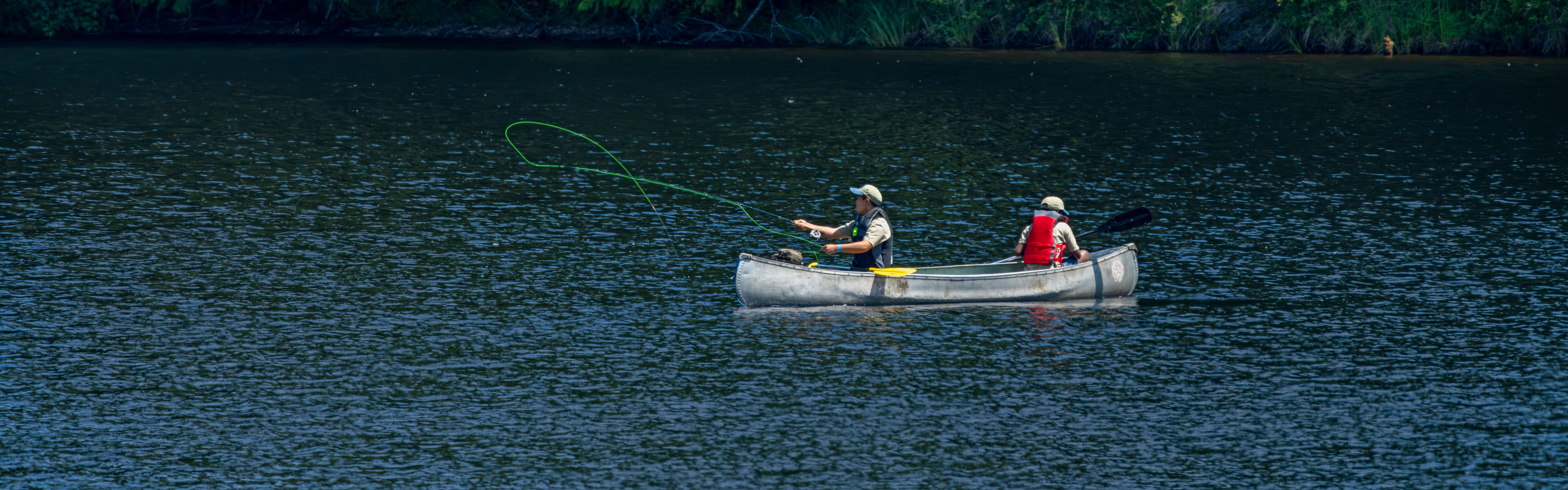 Two campers at the Northwest Youth Conservation and Fly Fishing Academy angling for trout on Panhandle Lake in Shelton, Washington.