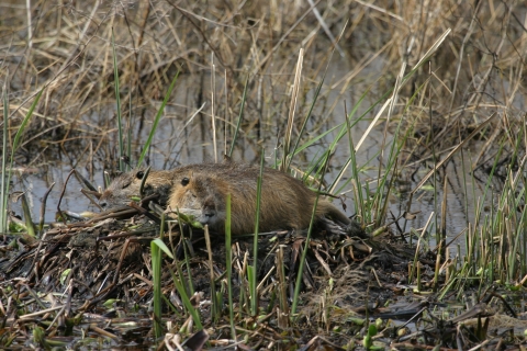 Two nutria at edge of water on mat of plant matter.