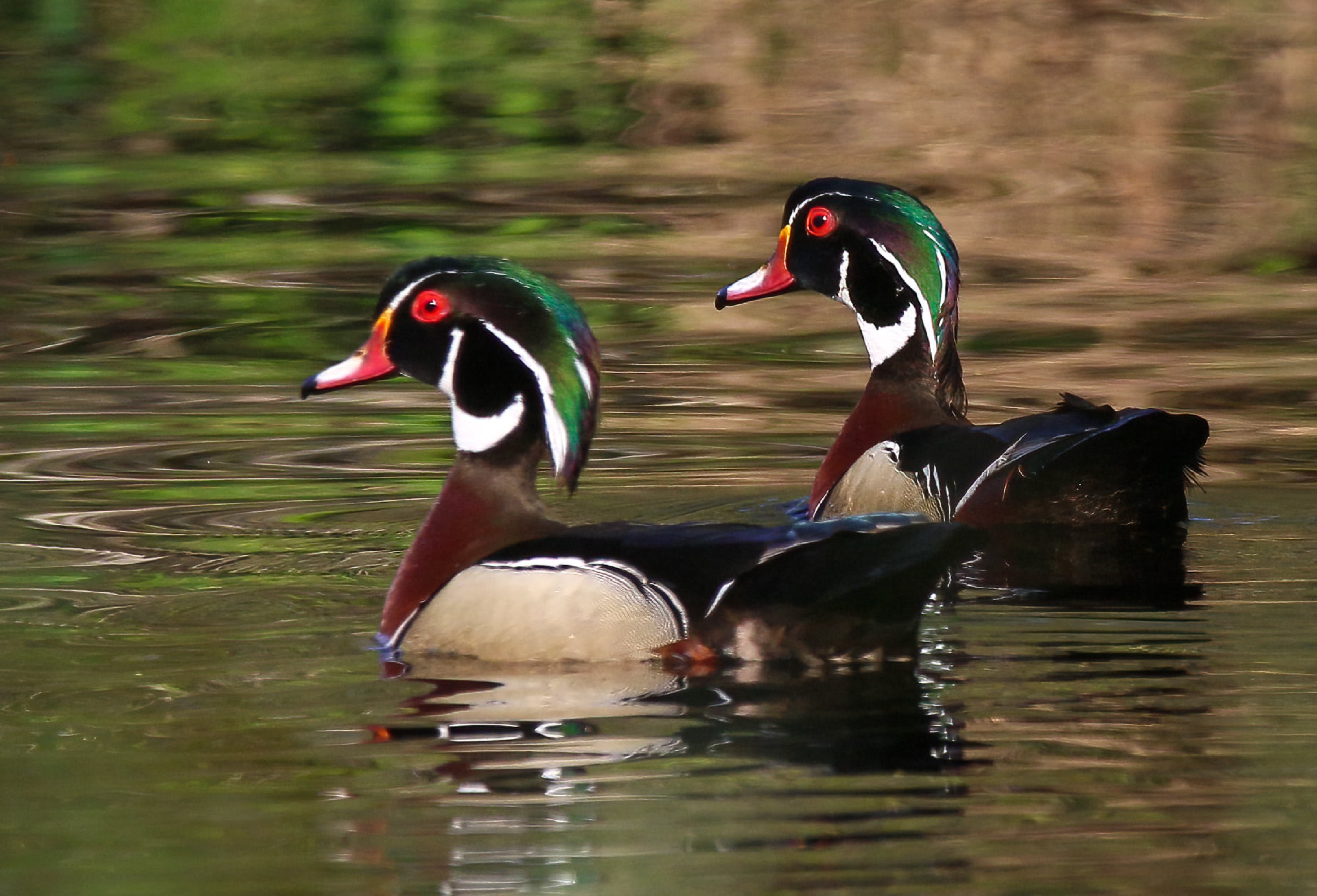 Two wood ducks swimming at Alligator River NWR